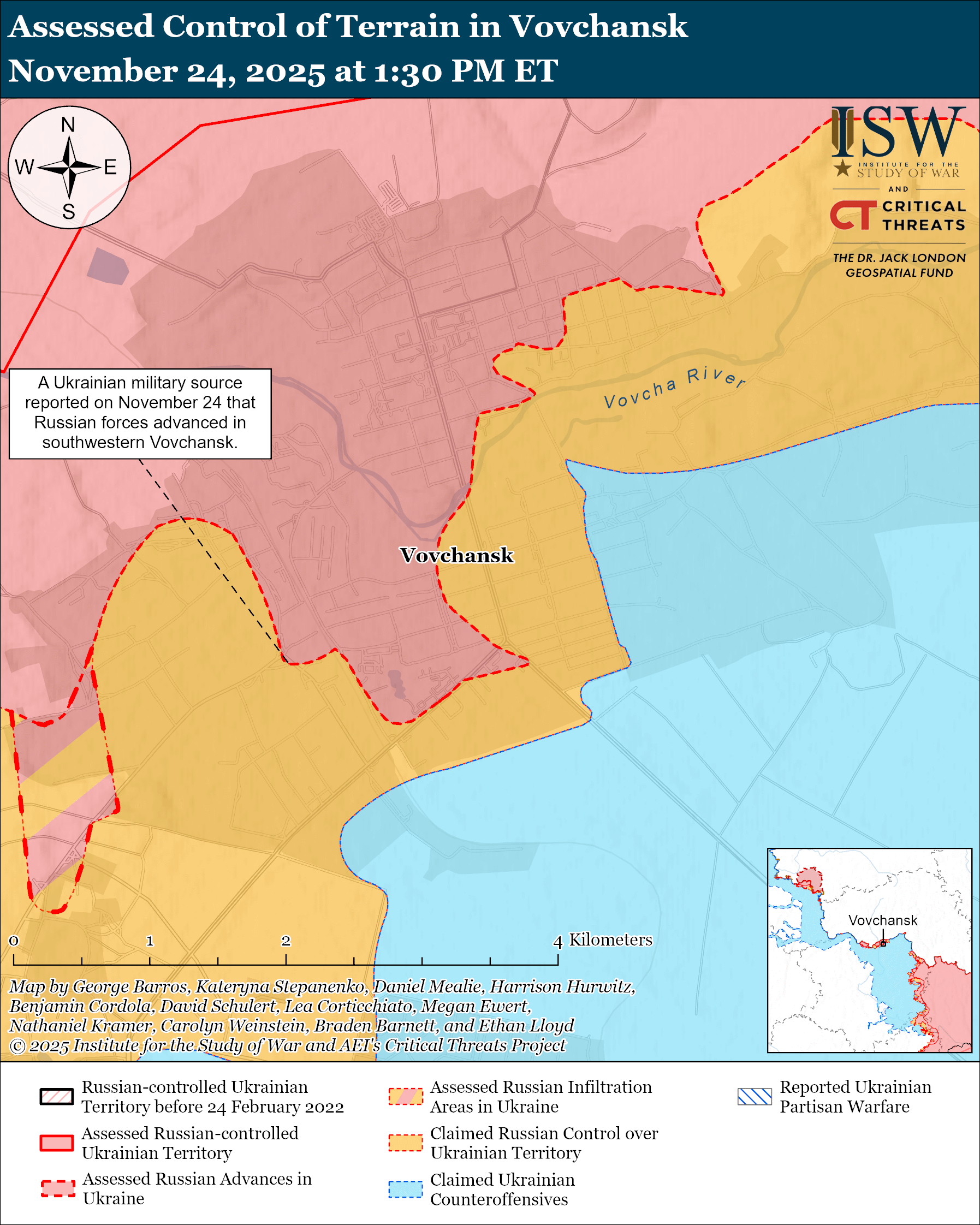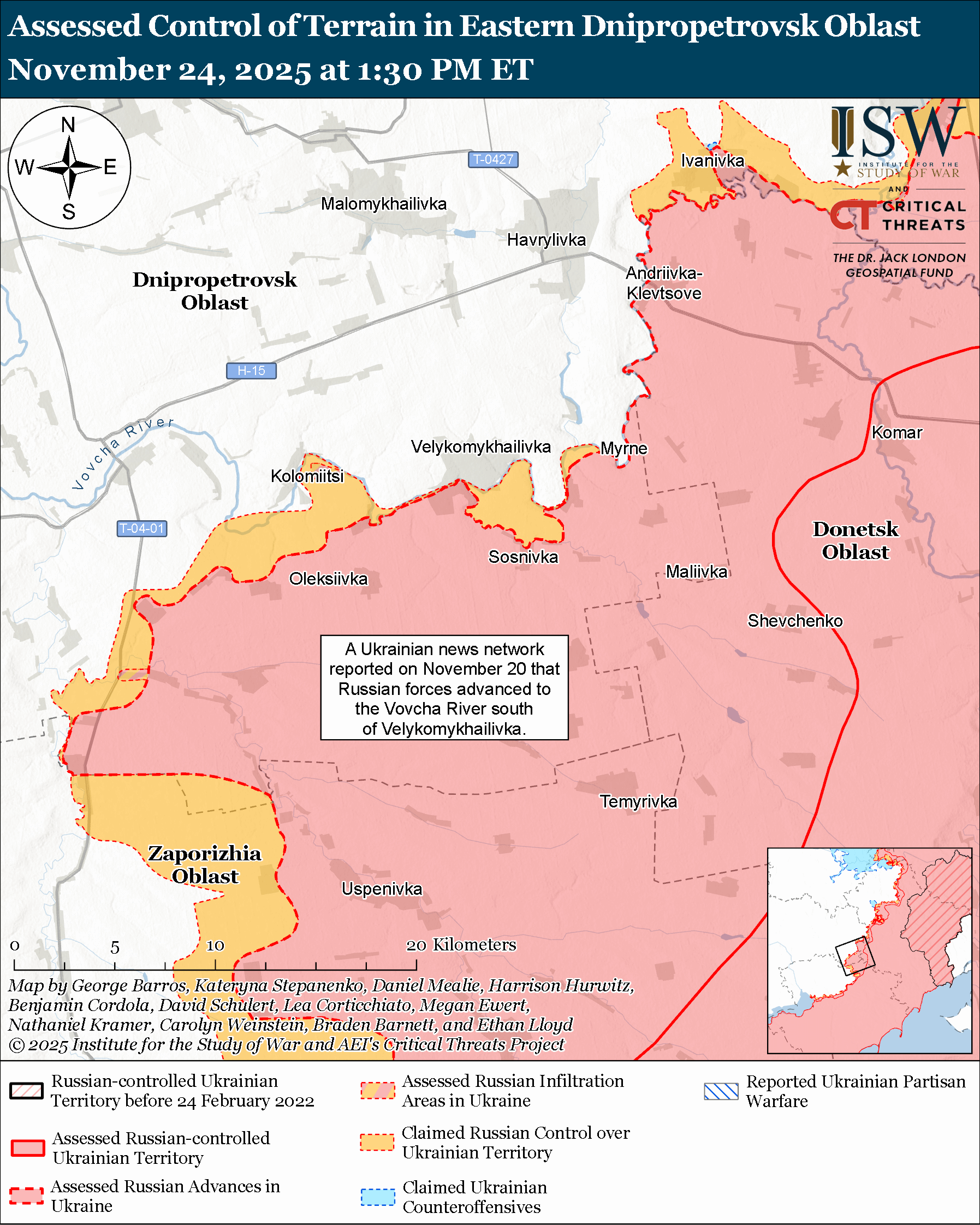 Russian officials and ultranationalist voices continue rejecting the original and revised US-proposed peace plan drafts and are attempting to portray Europe as responsible for the Russian rejection. Russian officials and ultranationalist voices have been rejecting the 28-point US peace plan since it was first reported in mid-November 2025 because the proposed plan did not concede to all of Russia's absolutist war demands.[xii] Russian officials and ultranationalist voices are simultaneously misrepresenting revisions to the original plan and European involvement as undermining the peace process, likely in an effort to deflect from Russia's own rejection of the deal. Kremlin Presidential Aide Yuriy Ushakov stated on November 24 that the European version of the peace proposal is unacceptable for Russia, and Russian State Duma International Affairs Committee Chairperson Leonid Slutsky claimed that the European proposal would only continue the war.[xiii] Duma International Affairs Committee Deputy Chairperson Svetlana Zhurova claimed that continued US changes to the peace plan will "drag on" the negotiations "endlessly."[xiv] Zhurova claimed that the only two relevant negotiating parties are Russia and the United States, implying that any peace plans must exclude Ukrainian and European inputs.[xv] Russian ultranationalist milbloggers, a key pro-war constituency for Russian President Vladimir Putin, continued to reject the modified peace proposal, criticize the United States for moving away from Russian demands, and claim that Europe only wants to continue the war in Ukraine.[xvi] The milbloggers called for Russia to achieve its war aims by force instead.[xvii] The Kremlin has refused to meaningfully negotiate in response to all US-led peace initiatives thus far in 2025, and has shown no willingness to make the significant compromises required of a negotiation process.[xviii] The Kremlin very likely aims to prolong negotiations to end the war to allow Russian forces to continue advancing on the battlefield. The Kremlin likely plans to use Russian advances to further intensify information operations aimed at convincing the West and Ukraine that a Russian military victory is inevitable and that Ukraine should capitulate to Russia's demands. The Kremlin continues to show no willingness to compromise for good-faith peace negotiations and has not set conditions for Russians to accept anything less than a full Russian victory in Ukraine.