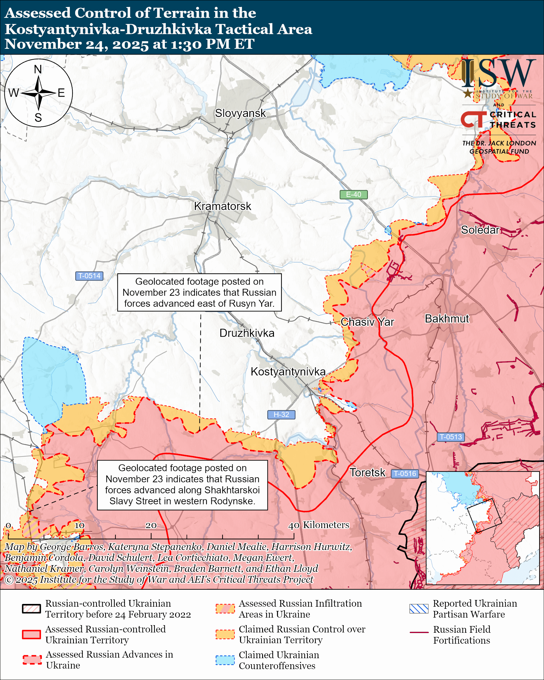 Ukrainian forces maintain a limited presence and continue to counterattack within Pokrovsk, indicating that Russian forces likely remain unable to rapidly seize Pokrovsk at this time. Geolocated footage published on November 24 indicates that Ukrainian forces maintain positions along the E-50 Pokrovsk-Pavlohrad highway in northwestern Pokrovsk, where Russian sources previously claimed that Russian forces maintained a presence.[xix] Geolocated footage published on November 24 shows Ukrainian forces patrolling in northern Pokrovsk in areas where Russian forces previously infiltrated, and a Ukrainian assault regiment operating in Pokrovsk reported that Ukrainian forces cleared central Pokrovsk of Russian forces.[xx] Other Ukrainian military and media sources provided contradictory accounts of reported Ukrainian clearing operations within Pokrovsk, however. Ukrainian Volunteer Army Spokesperson Serhiy Bratchuk and a Ukrainian journalist reported on November 23 and 24 that Ukrainian forces cleared several streets and areas near the Donetska railway and E-50 highway and that Ukrainian forces continue to control some neighborhoods within Pokrovsk.[xxi] A Ukrainian military source stated on November 23 that Ukrainian forces cleared "specific areas" within Pokrovsk and assessed that these advances may improve the tactical situation for Ukrainian forces within Pokrovsk but would not impact the operational situation in the area.[xxii] Other Ukrainian military sources refuted on November 24 reports that Ukrainian forces cleared central Pokrovsk.[xxiii] All of the Ukrainian reporting continues to indicate that Ukrainian forces maintain positions and some degree of ability to operate within Pokrovsk despite weeks of intensified Russian efforts to seize the town.