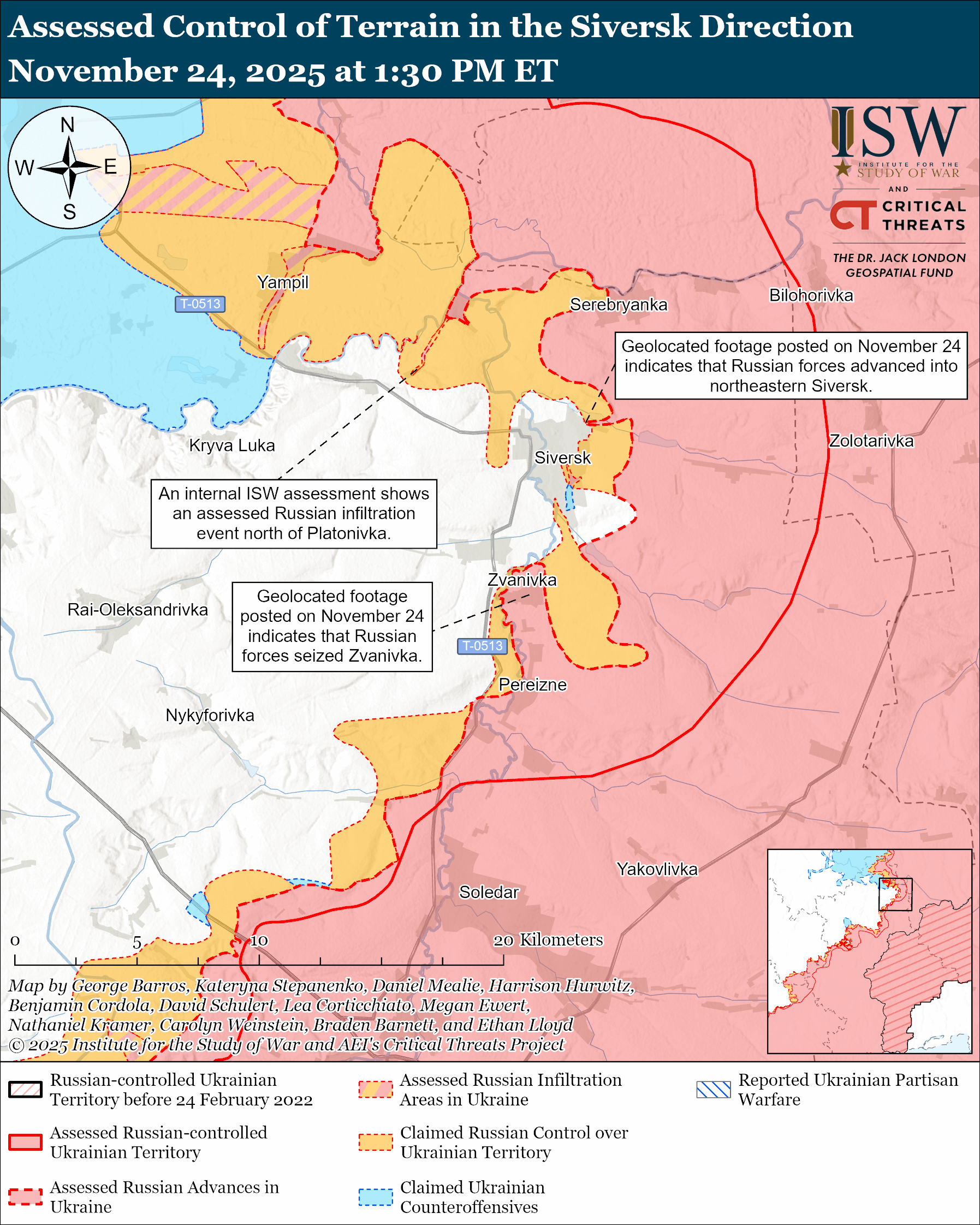 Russian forces attacked near and within Siversk itself; northwest of Siversk near Dronivka, Platonivka, and Zakitne; northeast of Siversk near Serebryanka; and southeast of Siversk near Vyimka, Zvanivka, and Sakko i Vantsetti on November 23 and 24.[lxxix]