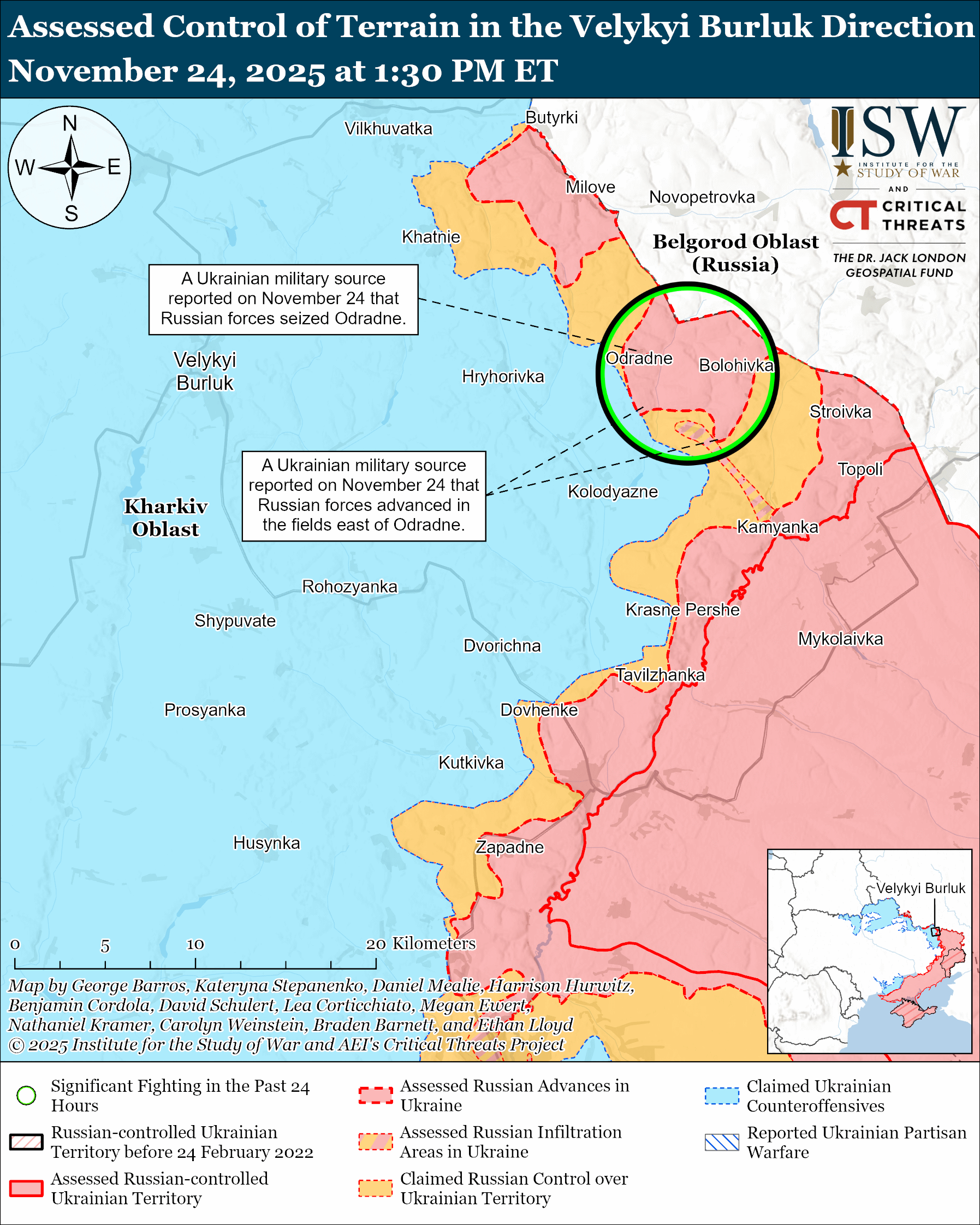Assessed Russian advances: Mashovets reported on November 24 that Russian forces recently seized Odradne (east of Velykyi Burluk) after advancing from Bolohivka (southeast of Odradne), indicating that Russian forces also seized Bolohivka on a prior date.[lvi] Mashovets also reported that Russian forces advanced east of Odradne.[lvii] A Russian milblogger also claimed on November 24 that Russian forces seized Odradne.[lviii]
