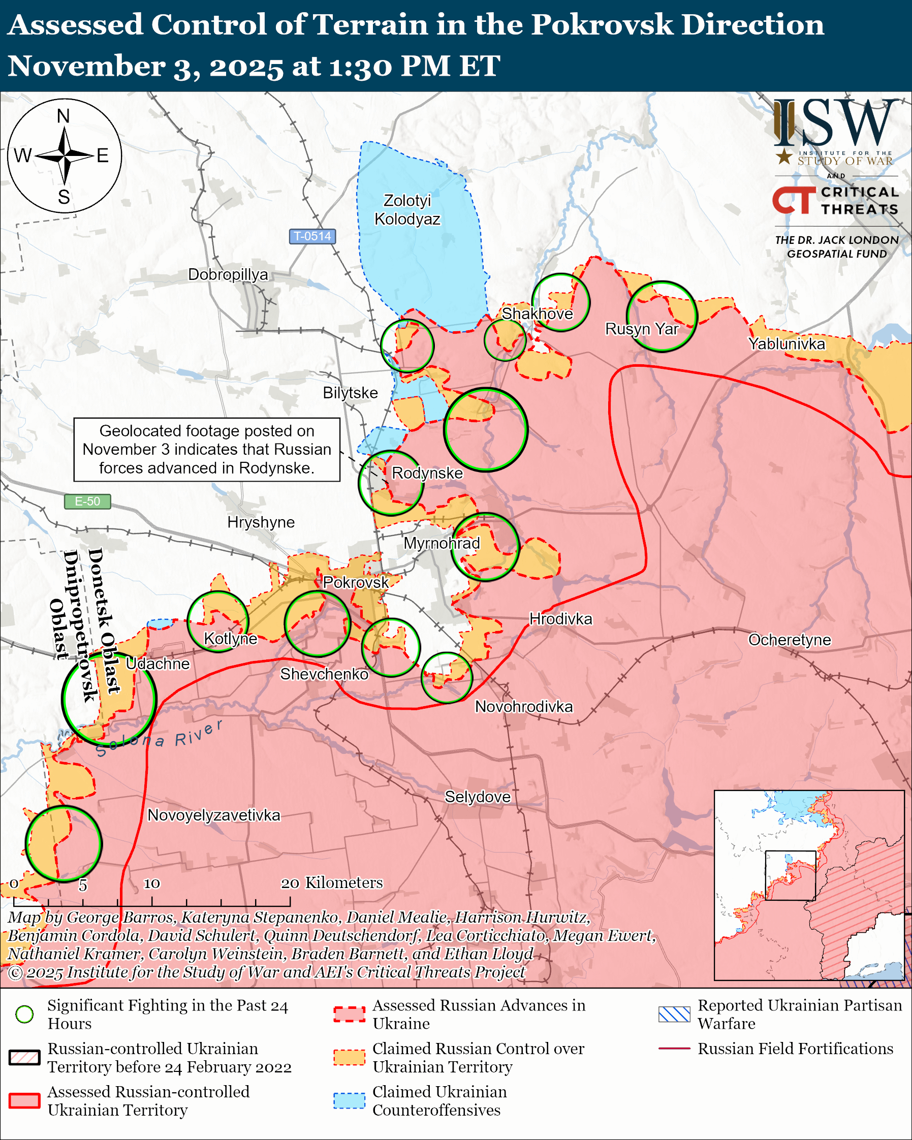 Ukrainian forces continue defensive efforts and counterattacks in the Pokrovsk direction. Geolocated footage published on November 3 indicates that Ukrainian forces recently advanced in eastern Rodynske, an area in which Russian sources previously claimed that Russian sources maintained a presence.[6] The Ukrainian 7th Rapid Reaction Corps of the Air Assault Forces reported that Ukrainian forces "created opportunities" to resupply and reinforce troops in the Pokrovsk direction in the last few days.[7] The corps stated that Ukrainian forces prevented Russian forces from further advances in northern Pokrovsk and from cutting the H-32 Pokrovsk-Myrnohrad highway.