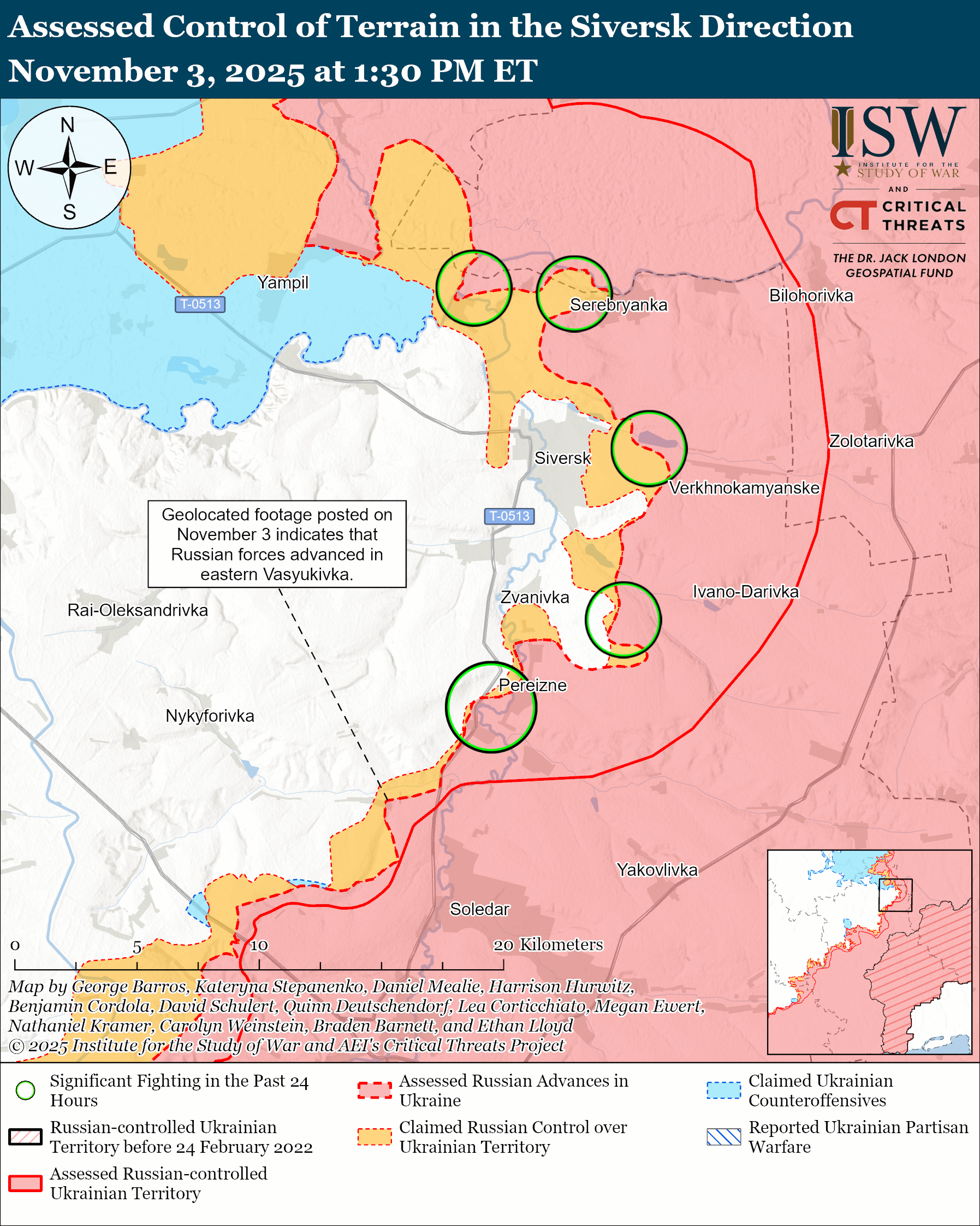 Assessed Russian advances: Geolocated footage published on November 3 indicates that Russian forces recently advanced in eastern Vasyukivka (southwest of Siversk).[58]