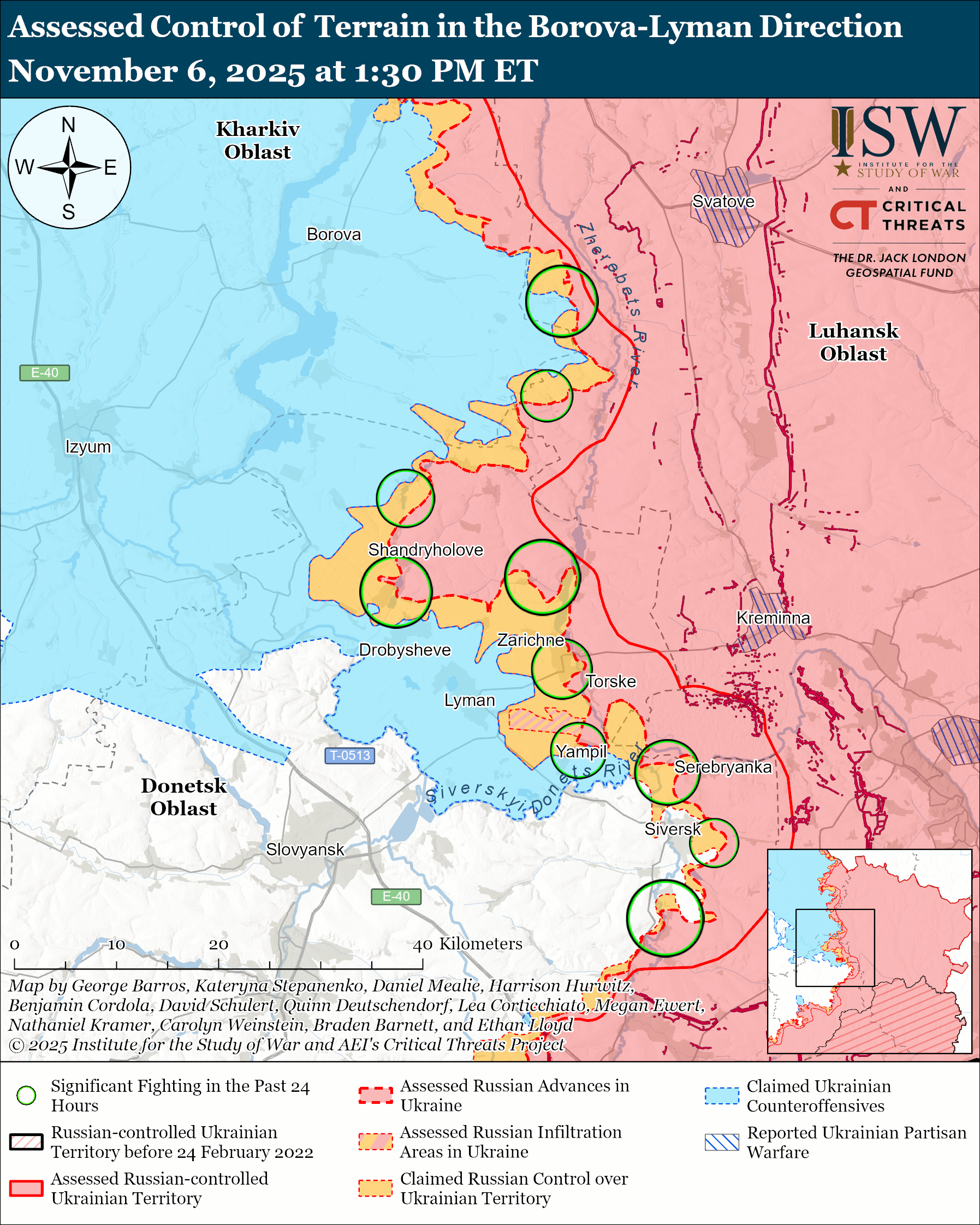 Russian forces continued offensive operations in the Velykyi Burluk direction on November 6 but did not make confirmed advances.