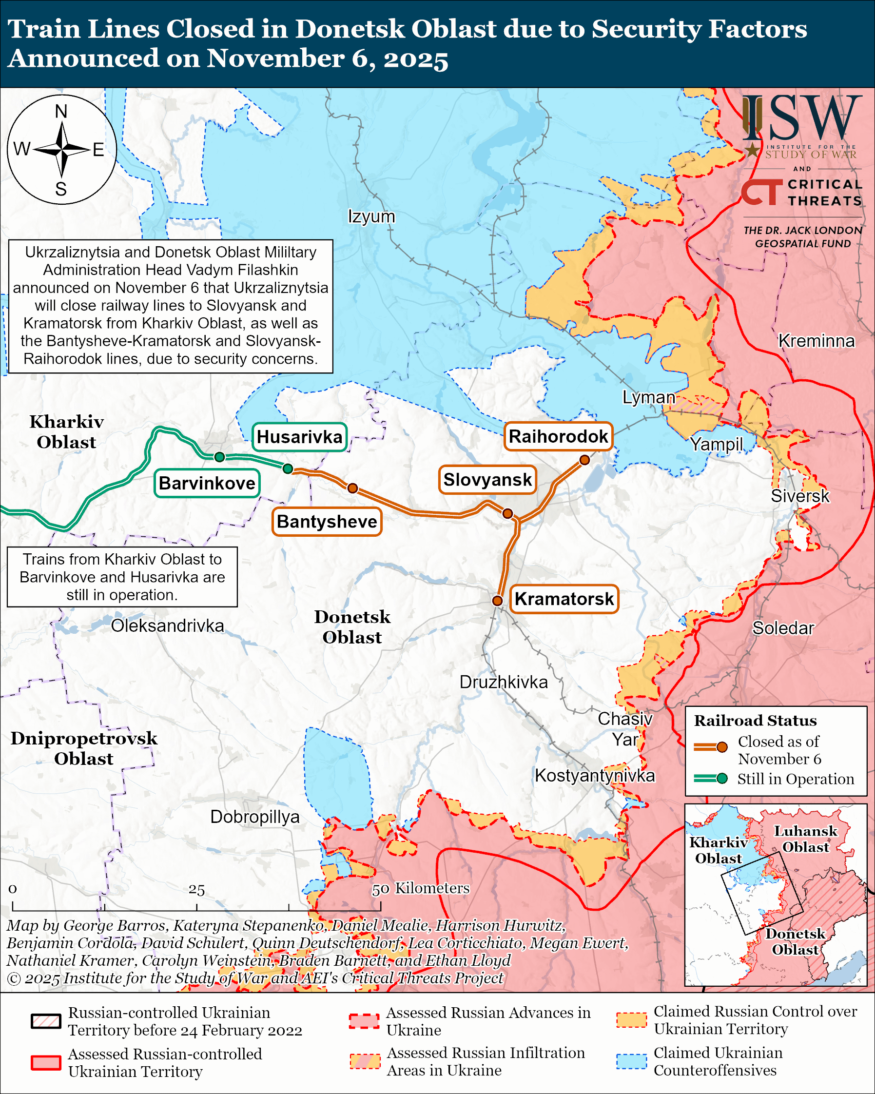Russian forces are intensifying their battlefield air interdiction (BAI) campaign against Ukrainian railway infrastructure, seeking to disrupt Ukrainian rear logistics hubs to erode frontline forces and eventually facilitate frontline gains. Ukrainian railway operator Ukrzaliznytsia announced on November 6 that it will temporarily close the railway line from Husarivka, Kharkiv Oblast (west of Slovyansk, about 45 kilometers from the frontline) to Slovyansk (about 29 kilometers from the frontline) and Kramatorsk (about 22 kilometers from the frontline).[xi] Ukrzaliznytsia stated that it will also close the railway between Bantysheve (west of Slovyansk, about 40 kilometers from the frontline) and Kramatorsk and between Slovyansk and Raihorodok (southwest of Lyman, about 20 kilometers from the frontline). Ukrzaliznytsia cited “security factors” for the closures — likely referring to the recent intensification of Russian strikes against railways.