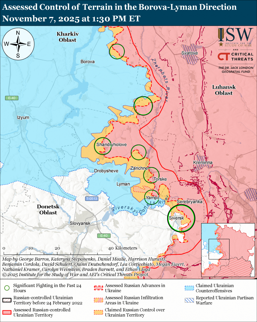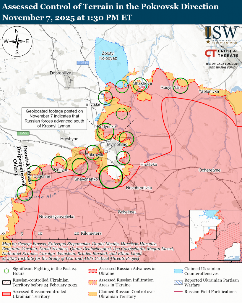 Russian forces continue to advance in the Pokrovsk direction and are reportedly extending logistics to southern Pokrovsk. Geolocated footage published on November 6 and 7 indicates that Russian forces recently advanced within northeastern and to the eastern outskirts of Pokrovsk as well as in southern Myrnohrad (east of Pokrovsk) and north of Myrnohrad.[1] Additional geolocated footage published on November 7 indicates that Russian forces also advanced south of Krasnyi Lyman (northeast of Pokrovsk and immediately north of Myrnohrad).[2] A Russian milblogger claimed that Russian forces reached the northwestern, northern, and northeastern outskirts of Pokrovsk.[3] Russian milbloggers claimed that Russian forces seized Rih (immediately east of Pokrovsk) and Rodynske (north of Pokrovsk), advanced southwest of Krasnyi Lyman and Rodynske, and advanced into eastern Rivne (east of Pokrovsk).[4] Some milbloggers claimed that fighting is ongoing in Rodynske, however.[5] Russian milbloggers claimed that Russian forces are attempting to drive trucks and motorcycles into southern Pokrovsk to deliver supplies and that these attempts mark the first time that Russian forces have begun operating vehicles in Pokrovsk.[6] Russian forces have been conducting logistics into Pokrovsk primarily with drones.[7] The Ukrainian 7th Rapid Reaction Corps of the Air Assault Forces confirmed on November 7 that Russian forces are attempting to extend logistics to southern Pokrovsk using motorcycles.[8] The corps reported that Russian forces have reduced their activity and the frequency of their movements within Pokrovsk in order to minimize losses as Russian forces await reinforcements. The corps noted that Russian forces have unsuccessfully attacked Myrnohrad from the east several times and assessed that Russian forces will likely attack the town from a different direction in the near future. A Russian milblogger claimed that Russian forces began attacking Myrnohrad from the west on November 7.[9] The spokesperson of a Ukrainian drone regiment operating in the Pokrovsk direction reported that Russian forces raised a flag at the Pokrovsk City Council building in central Pokrovsk but that Ukrainian forces counterattacked and recaptured and cleared the building.[10] The spokesperson noted that Russian forces established an observation post at the city council building before Ukrainian forces recaptured it.