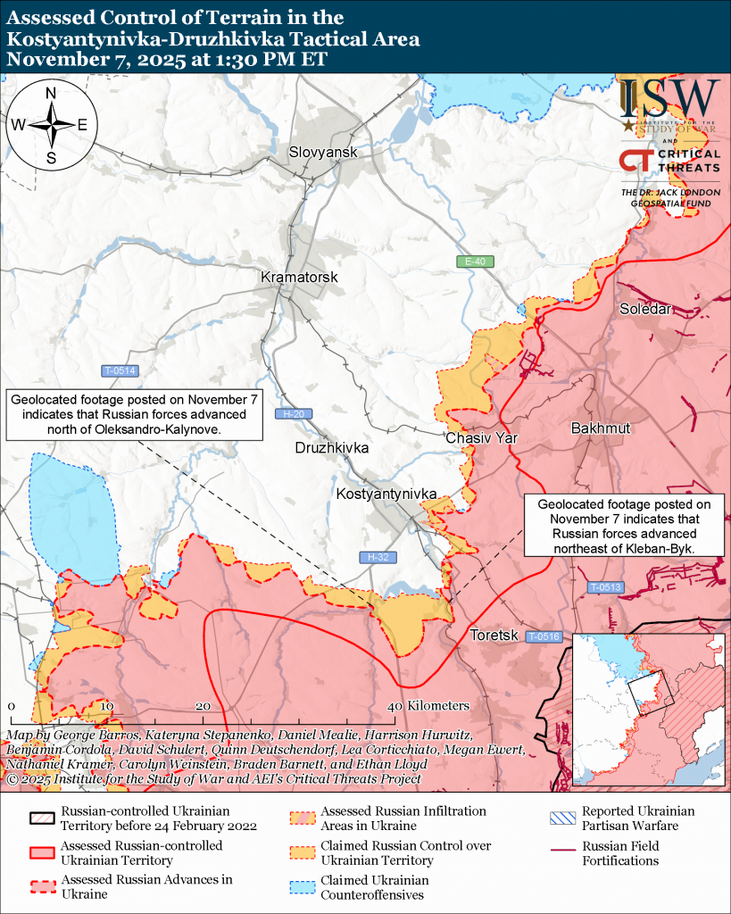 Assessed Russian advances: Geolocated footage published on November 7 indicates that Russian forces recently advanced northeast of Kleban-Byk (southeast of Kostyantynivka), on a section of the H-20 Kostyantynivka-Donetsk highway northwest of Yablunivka (south of Kostyantynivka), and marginally advanced in southern Ivanopillya (southeast of Kostyantynivka).[65]