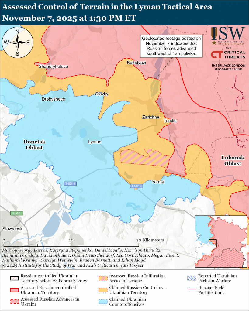 Russian forces attacked toward Lyman itself; northwest of Lyman near Drobysheve, Yarova, Korovii Yar, and Novoselivka; north of Lyman near Kolodyazi and Karpivka; east of Lyman near Zarichne; and southeast of Lyman near Yampil on November 6 and 7.[61]