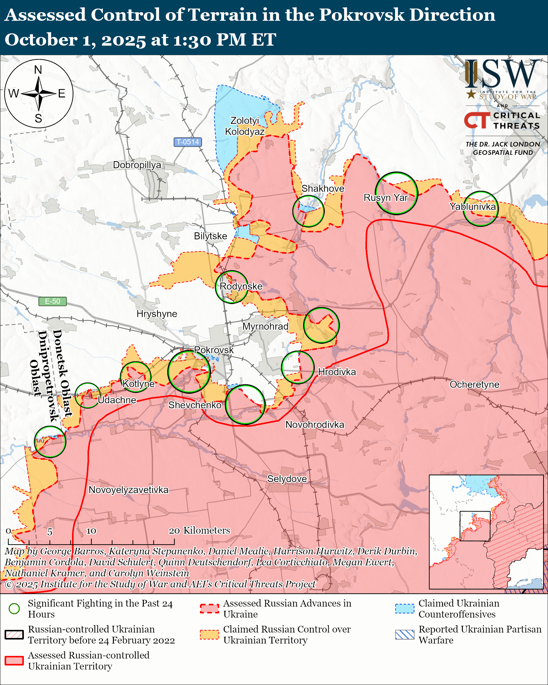 Russian forces attacked near Pokrovsk itself; north of Pokrovsk near Rodynske; northeast of Pokrovsk near Krasnyi Lyman, Sukhetske, Novotoretske, and Novoekonomichne; east of Pokrovsk near Myrnohrad, Myrolyubivka, and Promin; southeast of Pokrovsk near Novopavlivka and Lysivka; and southwest of Pokrovsk near Kotlyne, Udachne, Molodetske, and Zvirove on September 30 and October 1.[lxxx]