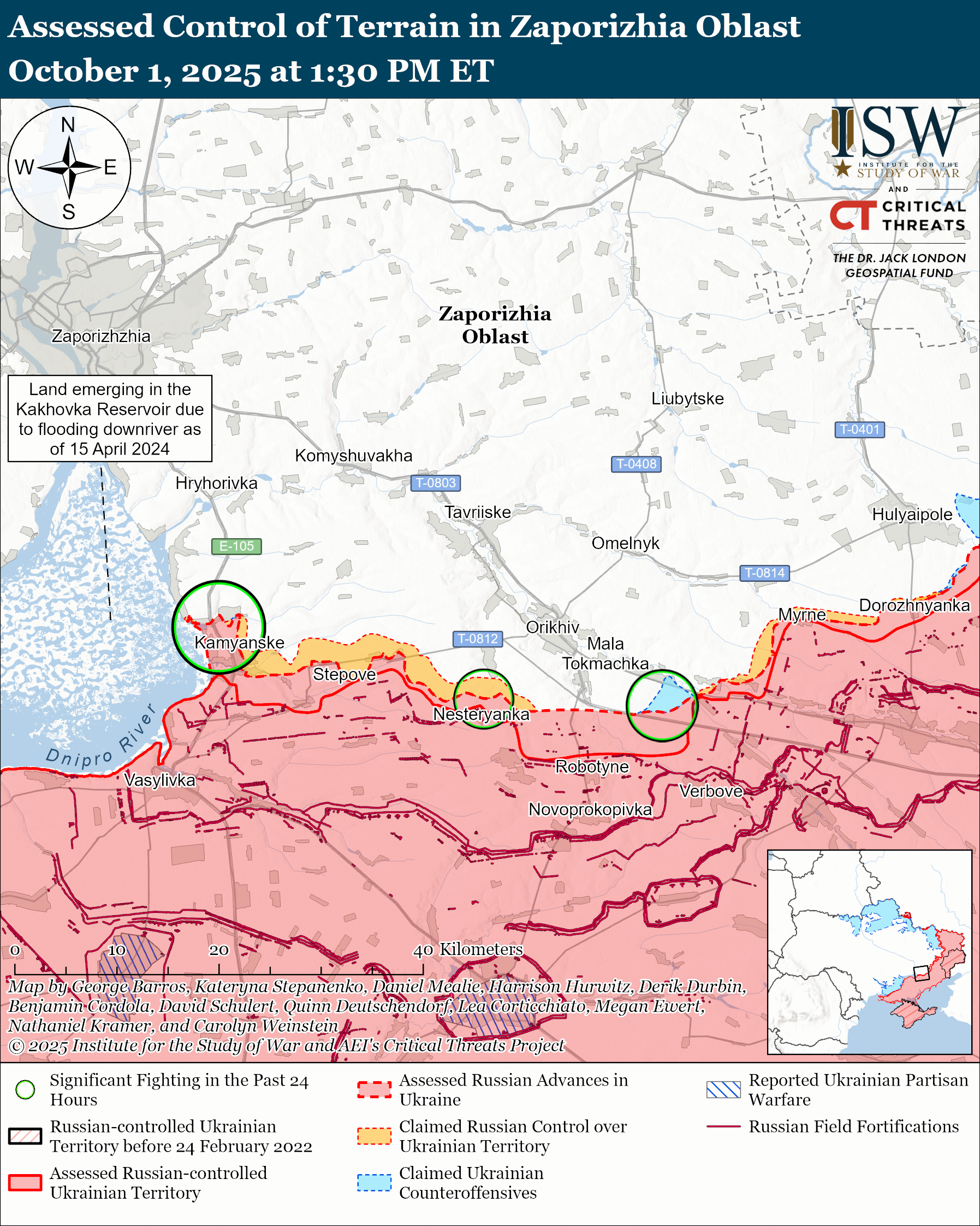 The Russian-occupied Zaporizhzhia Nuclear Power Plant (ZNPP) has been disconnected from the Ukrainian power grid for over a week as Russia sets conditions to imminently transfer the plant to the Russian power grid. Ukrainian and International Atomic Energy Agency (IAEA) officials reported on September 30 that the ZNPP has been disconnected from the Ukrainian power grid since September 23 and is relying on backup diesel generators to maintain its reactor cooling systems.[xxviii] The Ukrainian officials stated that Russian shelling damaged the final operational Ukrainian power line to the ZNPP, and the IAEA stated that the damage occurred about 1.5 kilometers from the ZNPP itself. Damage to the ZNPP's power lines has disconnected the ZNPP from the Ukrainian power grid nine other times since the full-scale invasion prior to September 23, and the current power outage is the longest the ZNPP has ever endured.[xxix] Ukrainian President Volodymyr Zelensky and Ukrainian Enerhodar Mayor in exile Dmytro Orlov stated that one of the diesel generators supporting the ZNPP has failed, as the diesel generators are not designed to operate for such a long period of time.[xxx] Orlov stated that continued Russian shelling of the area prevents Ukrainian authorities from repairing the power line.[xxxi] IAEA Director General Rafael Grossi stated that there is no immediate danger to the ZNPP, but that running on the diesel generators is not sustainable.[xxxii] Grossi stated that Ukraine has been ready to repair another power line to the ZNPP that has been disconnected since May 2025, but that the "military situation" has not allowed Ukraine to repair this power line. Russian officials denied the reports of Russian shelling and accused Ukrainian strikes of damaging the power line to the ZNPP.[xxxiii] Greenpeace Ukraine analyzed satellite imagery of damage to the power line since September 23 and assessed that there was no shelling of the power line, suggesting that Russian forces conducted sabotage operations against the power line.[xxxiv]