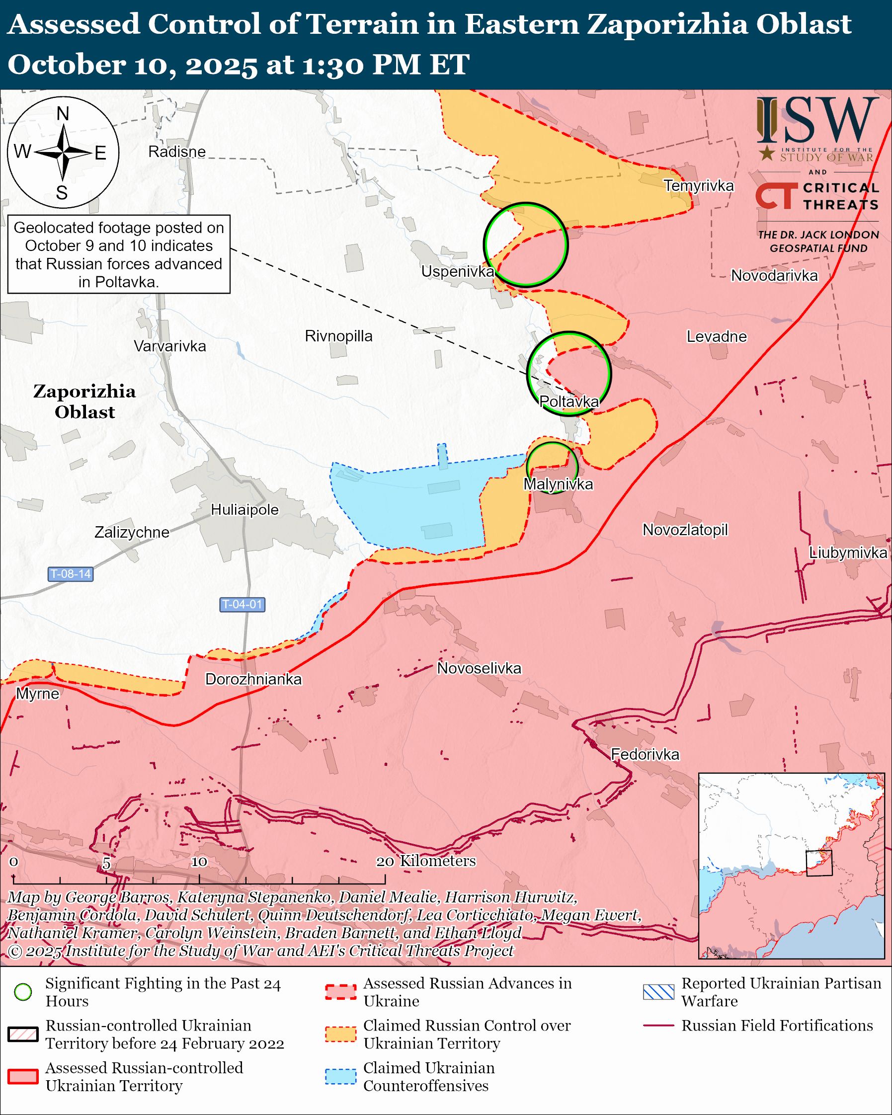 Russian forces attacked northeast of Hulyaipole near Malynivka, Poltavka, Novohryhorivka, Uspenivka, and Novovasylivske on October 9 and 10.[96]