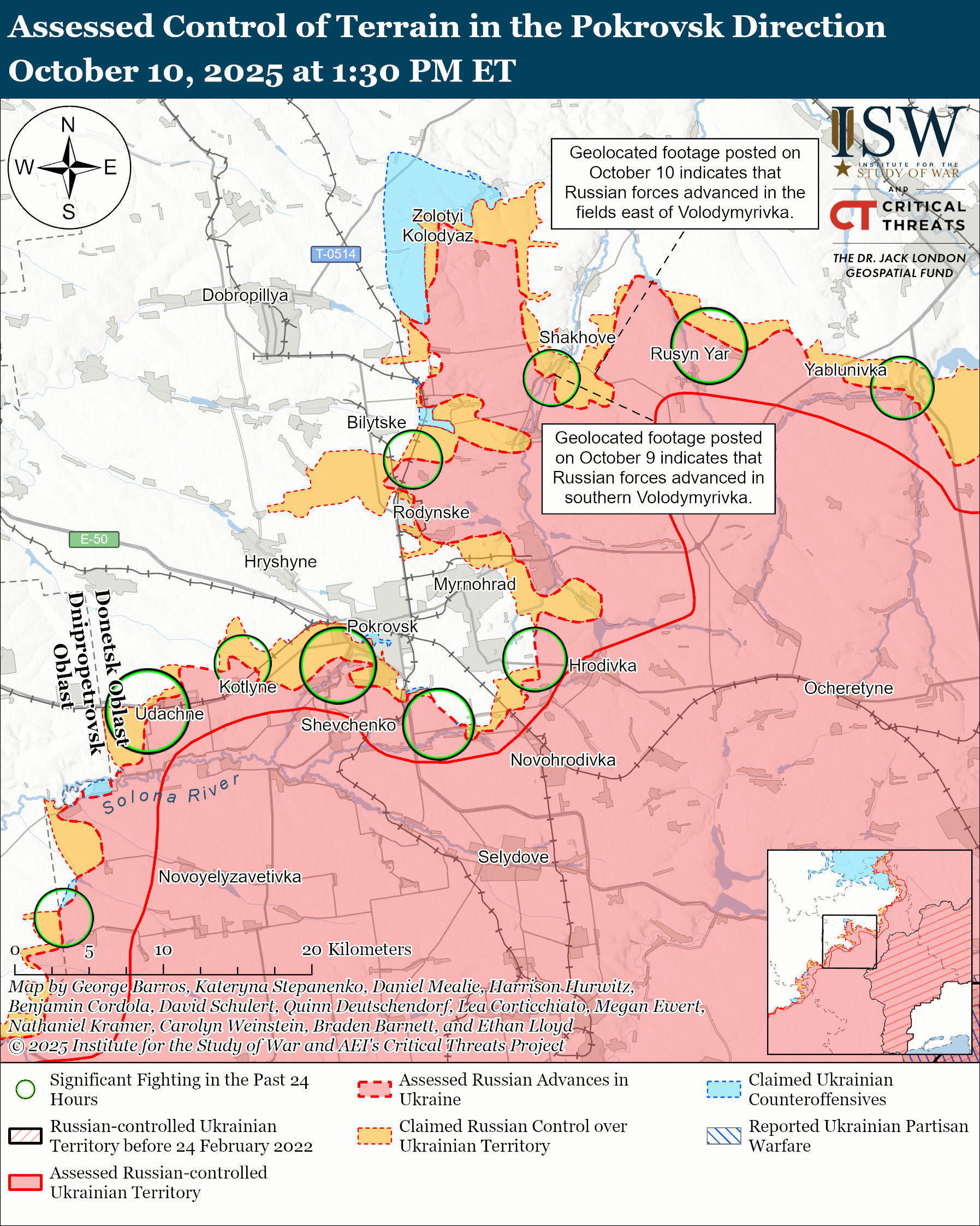 Russian forces continued offensive operations in the Pokrovsk direction on October 10 but did not make confirmed advances.