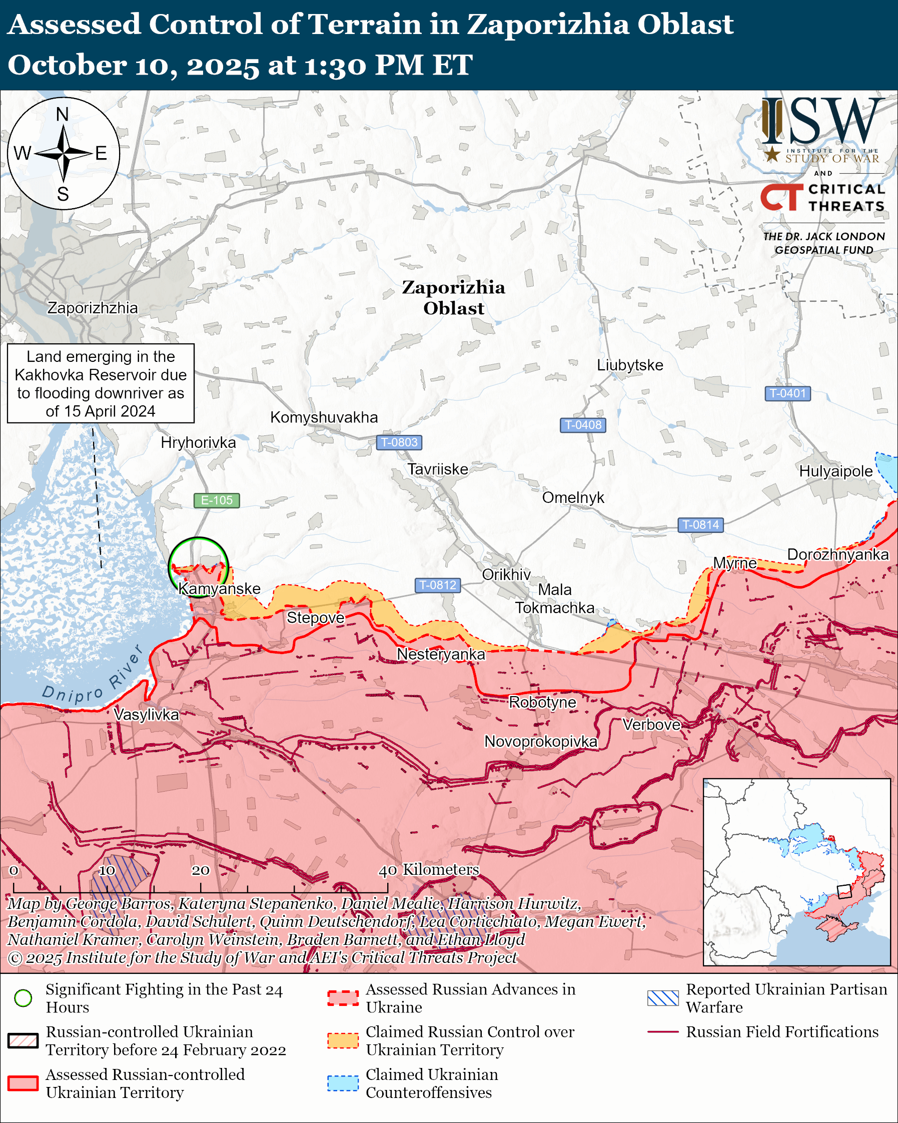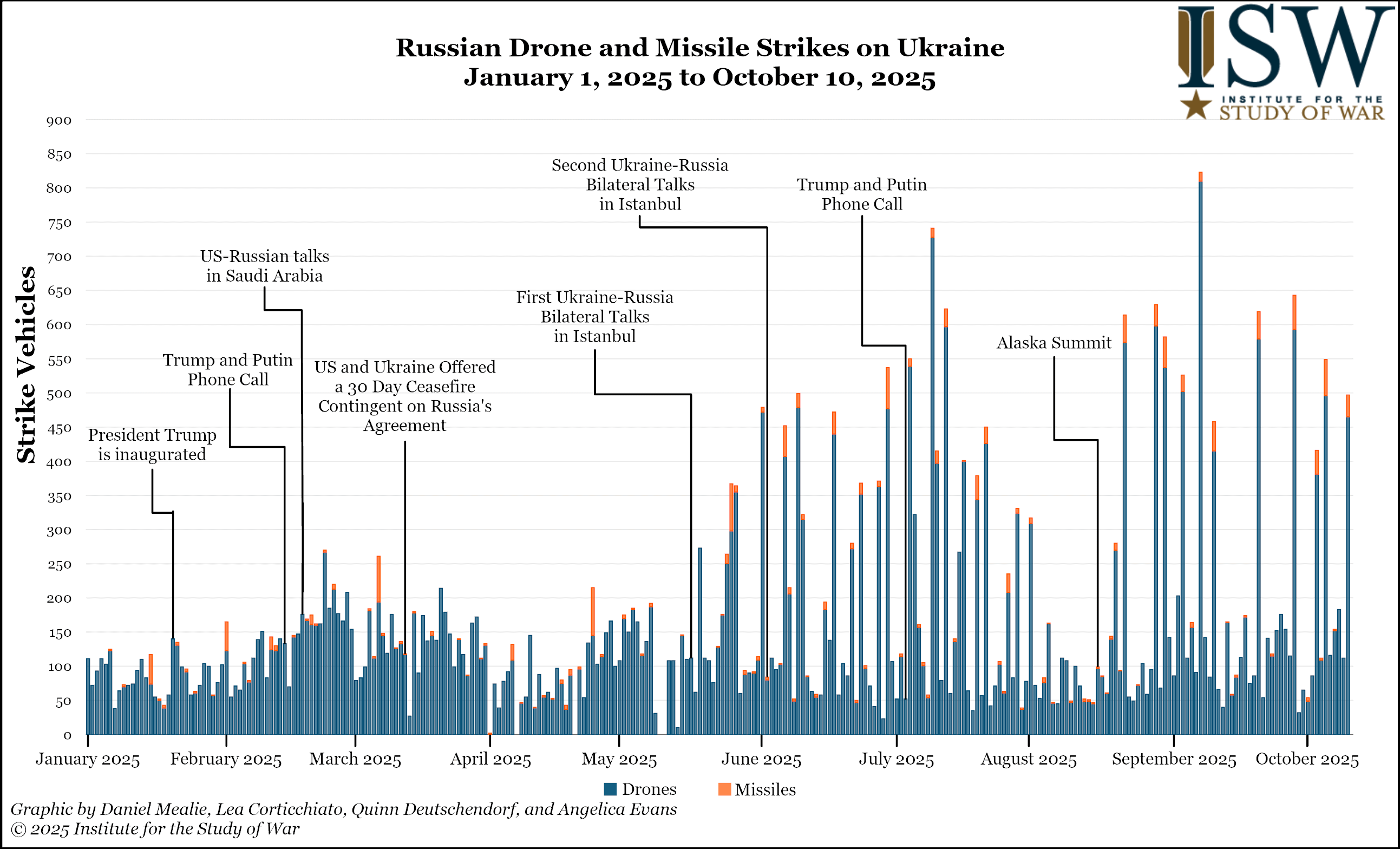 Ukrainian President Volodymyr Zelensky reported that Russian strikes injured over 20 civilians and killed a child in Zaporizhzhia City.[2] Zelensky stated that the Russian strikes caused power outages in Kyiv City and Oblast and Donetsk, Chernihiv, Cherkasy, Kharkiv, Sumy, Poltava, Odesa, and Dnipropetrovsk oblasts, and that Russian forces also targeted Zaporizhia, Kirovohrad, and Kherson oblasts. Ukrainian Foreign Minister Andriy Sybiha noted that October 10 is also the third anniversary of the first major Russian strike on Ukrainian energy infrastructure in 2022, underscoring Russia's annual efforts to undermine Ukrainian morale by striking energy infrastructure during the fall and winter.[3] Poltava Oblast Military Administration Head Volodymyr Kohut reported that Russian strikes against energy infrastructure left 16,578 households in Poltava Oblast without electricity.[4] Kyiv City Military Administration Head Timur Tkachenko reported that the Russian strikes left 5,800 apartment buildings and homes without power and water in the city.[5] Russia has increasingly used recent strikes to target smaller regional Ukrainian energy facilities with more limited air defenses, likely in an effort to capitalize on Ukraine's limited number of Patriot air defense systems.[6] ISW continues to assess that Russia is prioritizing strikes against civilian and energy infrastructure to continue its long-standing campaign to degrade Ukraine’s energy security ahead of winter 2025-2026 and demoralize the Ukrainian populace.[7] Russia's ongoing and ever-intensifying long-range strike campaign against Ukraine is just one indicator of Russian President Vladimir Putin's disinterest in peace.