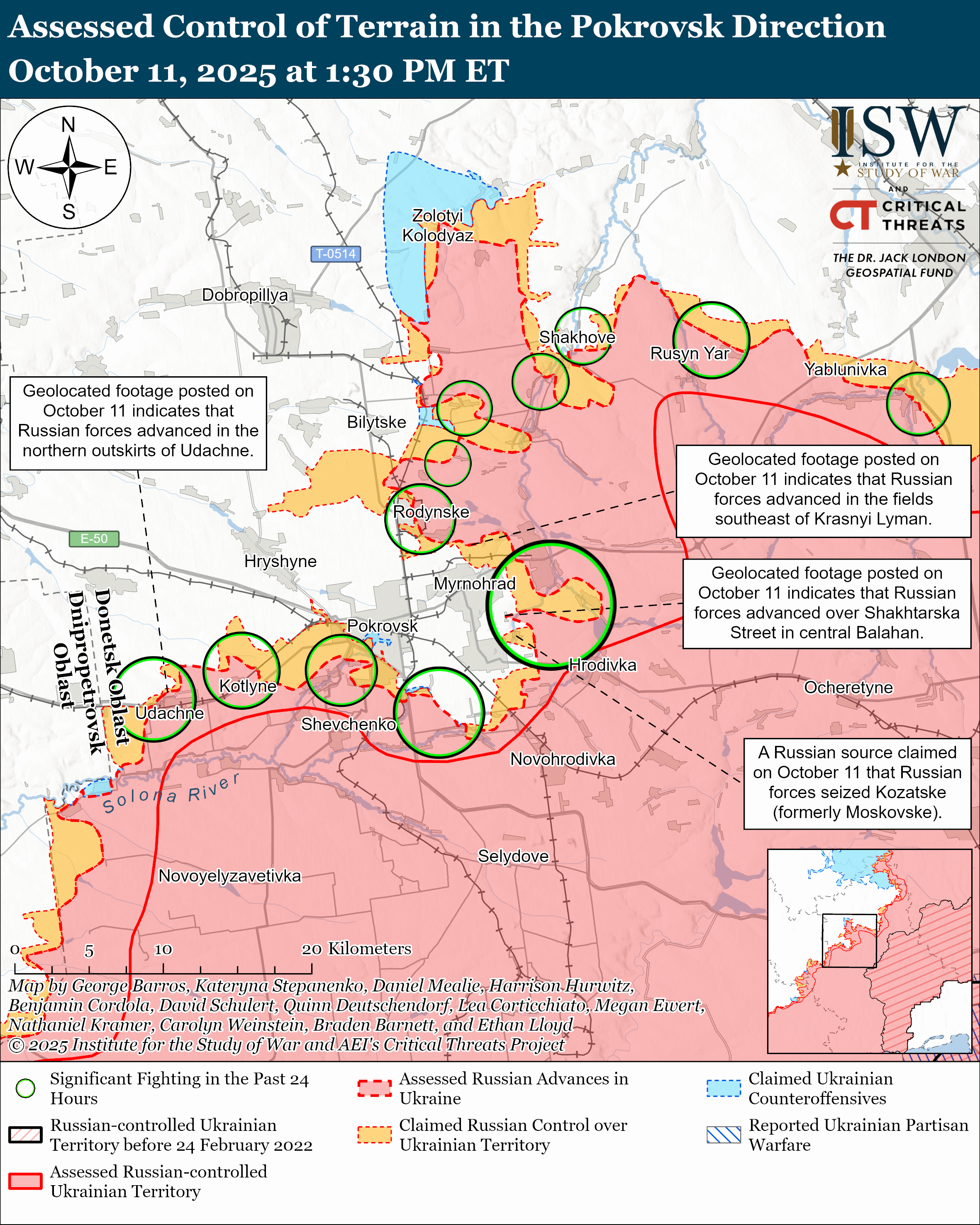 Assessed Russian advances: Geolocated footage published on October 11 indicates that Russian forces recently advanced southeast of Krasnyi Lyman (northeast of Pokrovsk), in central Balahan (east of Pokrovsk), and in the northern outskirts of Udachne (southwest of Pokrovsk).[50]