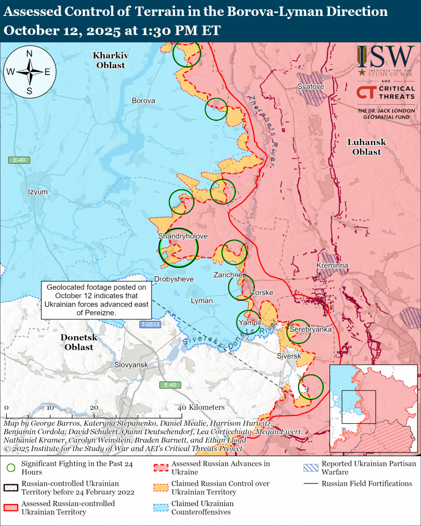 Russian forces attacked toward Lyman itself; northwest of Lyman near Drobysheve, Derylove, Serednie, and Shandryholove; north of Lyman near Karpivka and Novomykhailivka; northeast of Lyman near Kolodyazi and Myrne; east of Lyman near Torske; and southeast of Lyman near Yampil on October 11 and 12.[xxxvi]