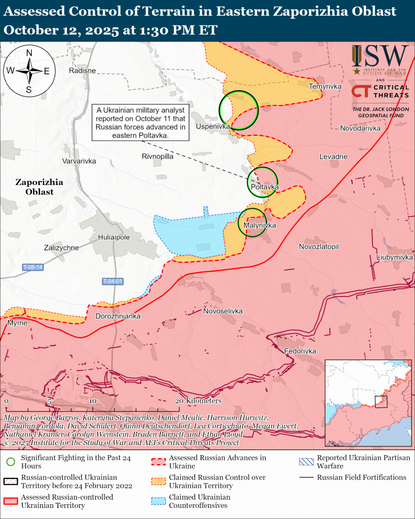Russian forces attacked northeast of Hulyaipole near Novohryhorivka, Poltavka, and Pavlivka, and east of Hulyaipole near Malynivka and Zelenyi Hai on October 11 and 12.[lix]