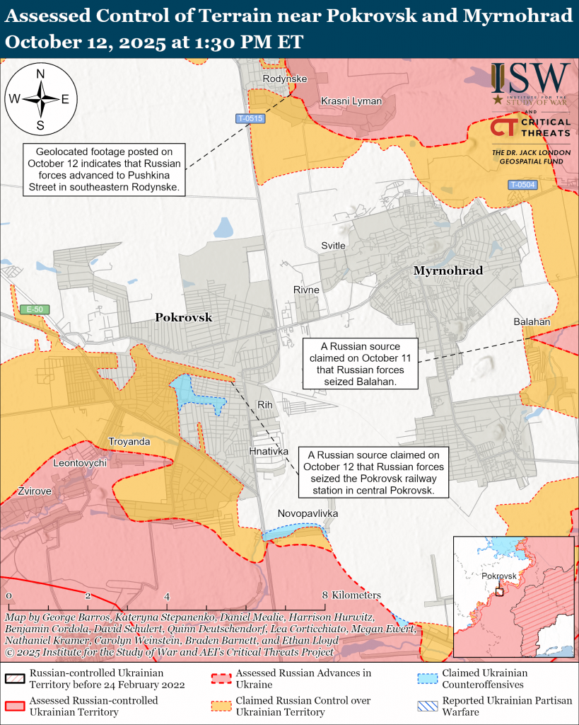 Russian forces attacked near Pokrovsk itself; north of Pokrovsk near Rodynske; northeast of Pokrovsk near Myrolyubivka, Novomykolaivka, Krasnyi Lyman, Zatyshok, Novoekonomichne, Fedorivka, Sukhetske, and Boykivka; east of Pokrovsk near Promin, Myrnohrad, and Balahan; southeast of Pokrovsk near Lysivka; south of Pokrovsk near Novopavlivka; and southwest of Pokrovsk near Zvirove, Udachne, Kotlyne, and Molodetske on October 11 and 12.[li] A Russian milblogger claimed that Ukrainian forces counterattacked in Lazurnyi Microraion in southern Pokrovsk and near Chunyshyne (south of Pokrovsk).[lii]
