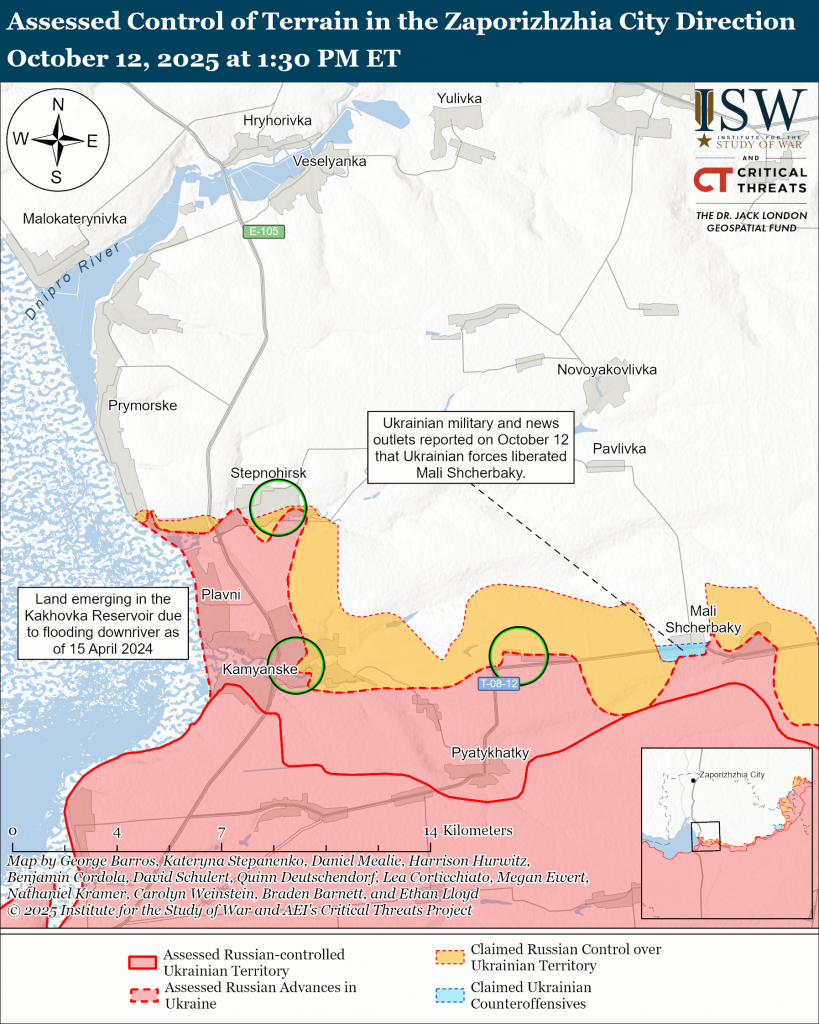 Assessed Ukrainian advances: A Ukrainian battalion operating in western Zaporizhia Oblast and Ukrainian Southern Defense Forces Spokesperson Colonel Vladyslav Voloshyn reported that Ukrainian forces liberated Mali Shcherbaky (southwest of Orikhiv).[lxiii] Geolocated footage published on October 12 shows elements of the Ukrainian battalion raising flags in the settlement.[lxiv]
