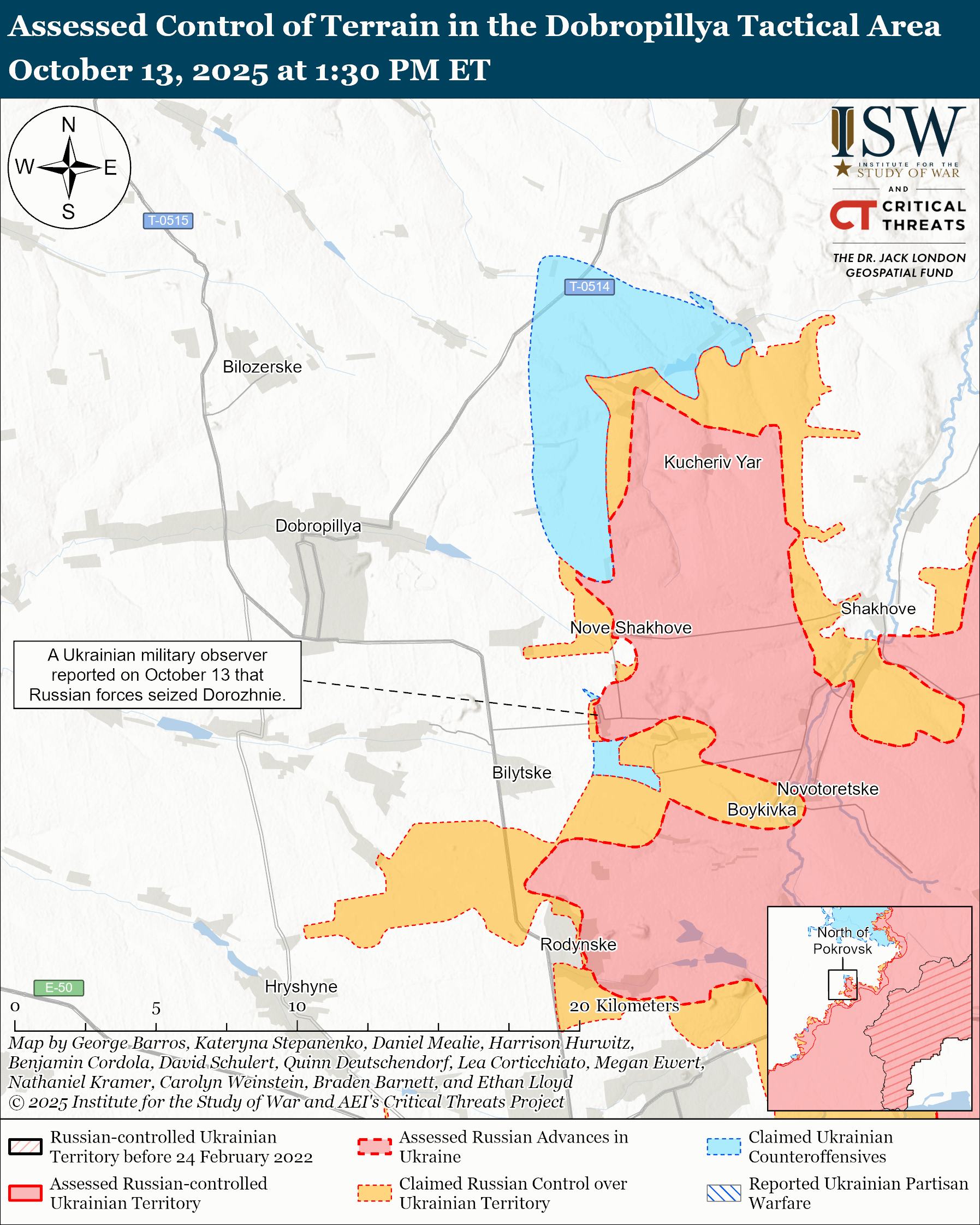 Assessed Russian advances: Ukrainian military observer Kostyantyn Mashovets stated that Russian forces seized Dorozhnie (southeast of Dobropillya).[l]