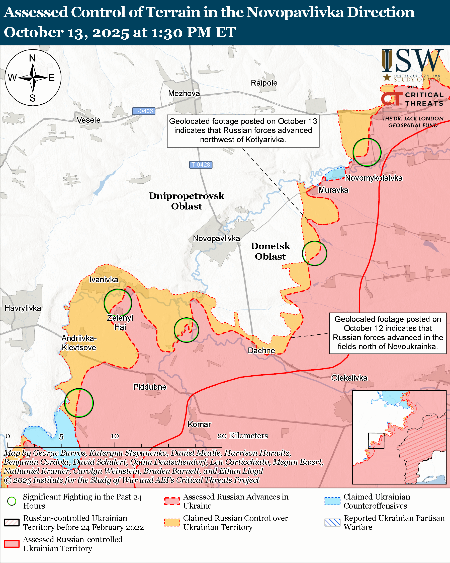 Assessed Russian advances: Geolocated footage published on October 12 and 13 indicates that Russian forces recently advanced northwest of Kotlyarivka (east of Novopavlivka) and north of Novoukrainka (south of Novopavlivka).[lxvi]