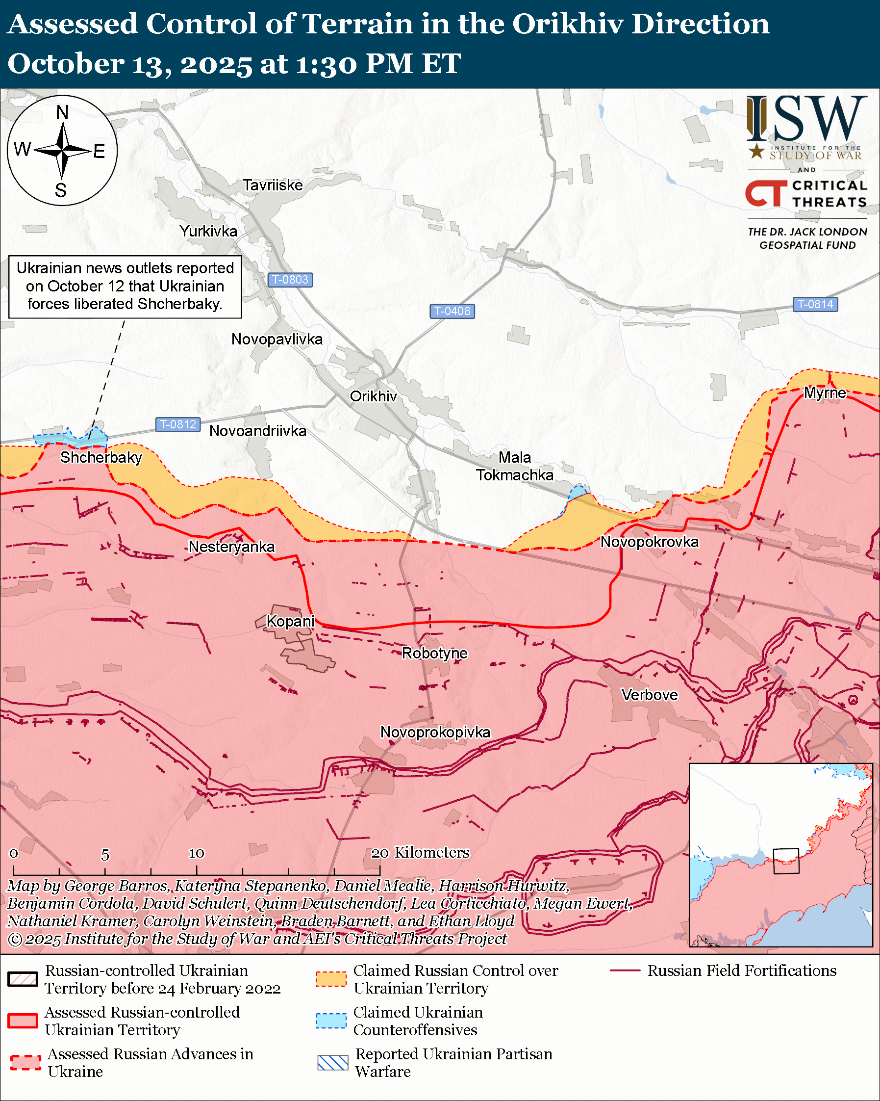 Assessed Ukrainian advances: A Ukrainian military spokesperson announced on October 12 that Ukrainian forces recently liberated Shcherbaky (west of Orikhiv).[lxxix]