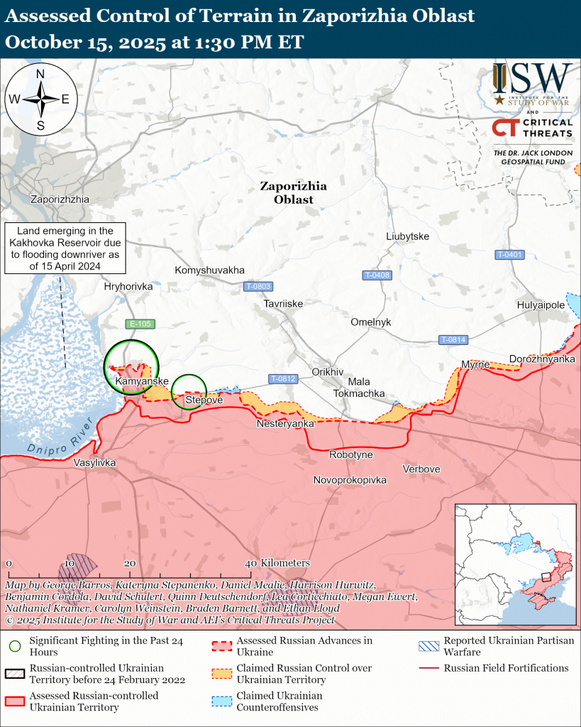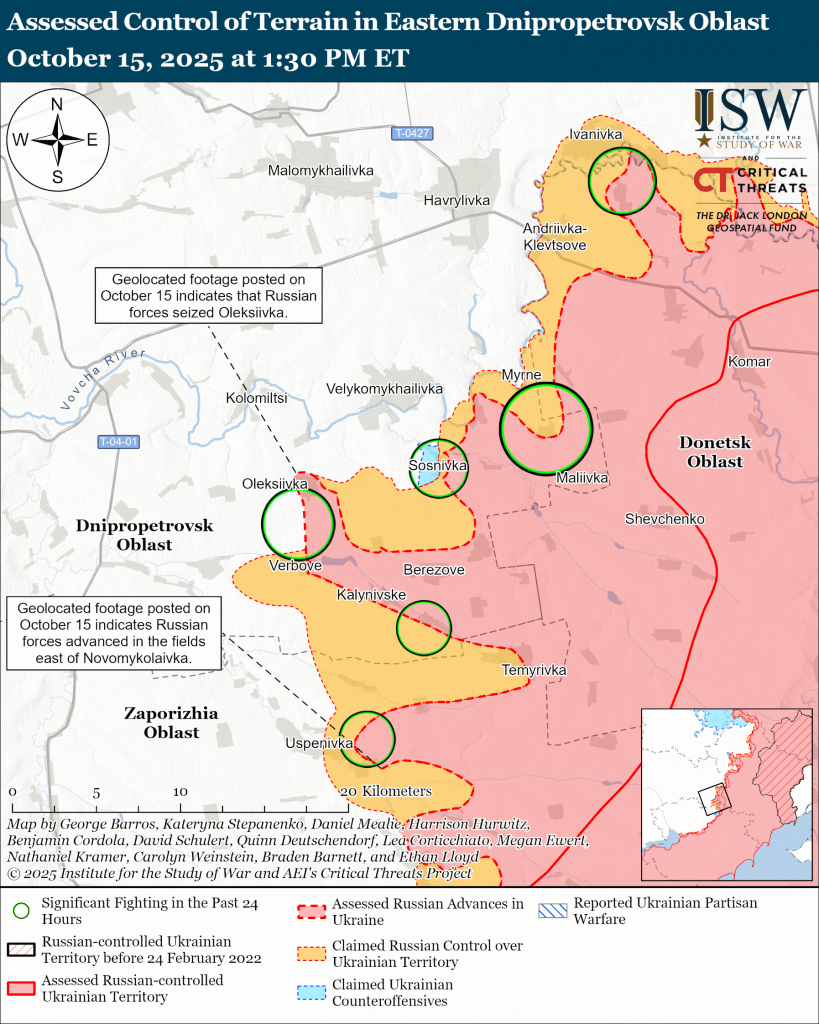 Refinement of areas under Russian claims: Geolocated footage published on October 15 indicates that Ukrainian forces maintain positions or recently advanced west of Malynivka (east of Hulyaipole) — an area in which Russian sources previously claimed that Russian forces maintained a presence.[lxxxii]