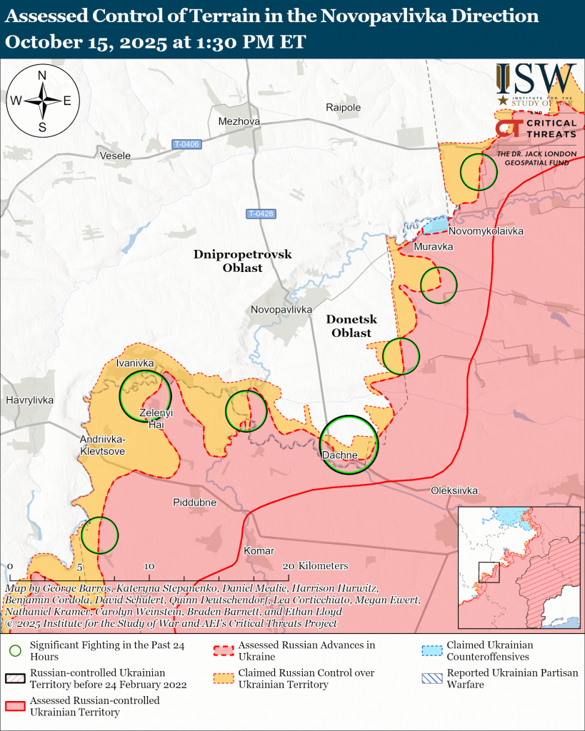 Russian forces continued offensive operations in the Novopavlivka direction on October 15 but did not advance.