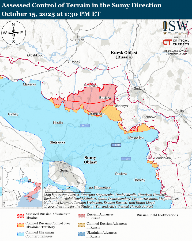 Russian forces continued offensive operations in northern Sumy Oblast on October 15 but did not make confirmed advances.