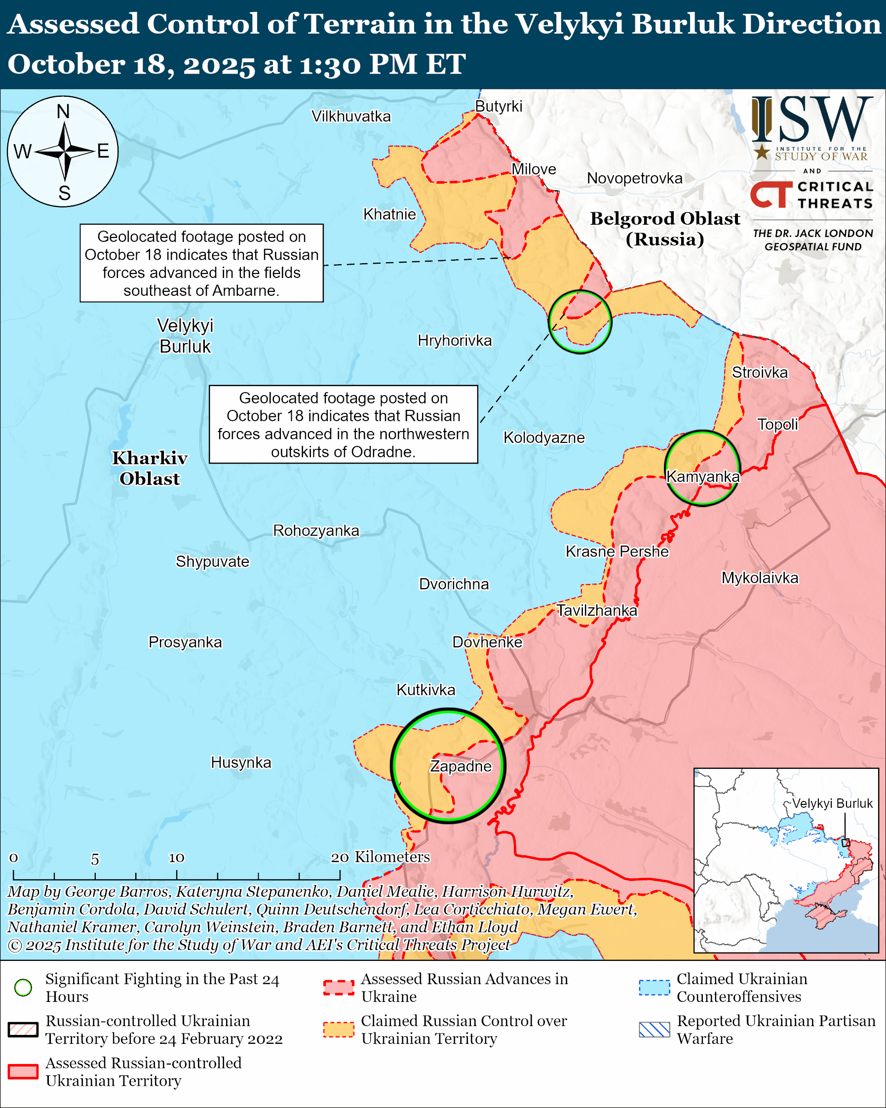 Assessed Russian advances: Geolocated footage published on October 18 indicates that Russian forces recently advanced southeast of Ambarne (northeast of Velykyi Burluk) and on the northwestern outskirts of Odradne (east of Velykyi Burluk).[xxxviii]