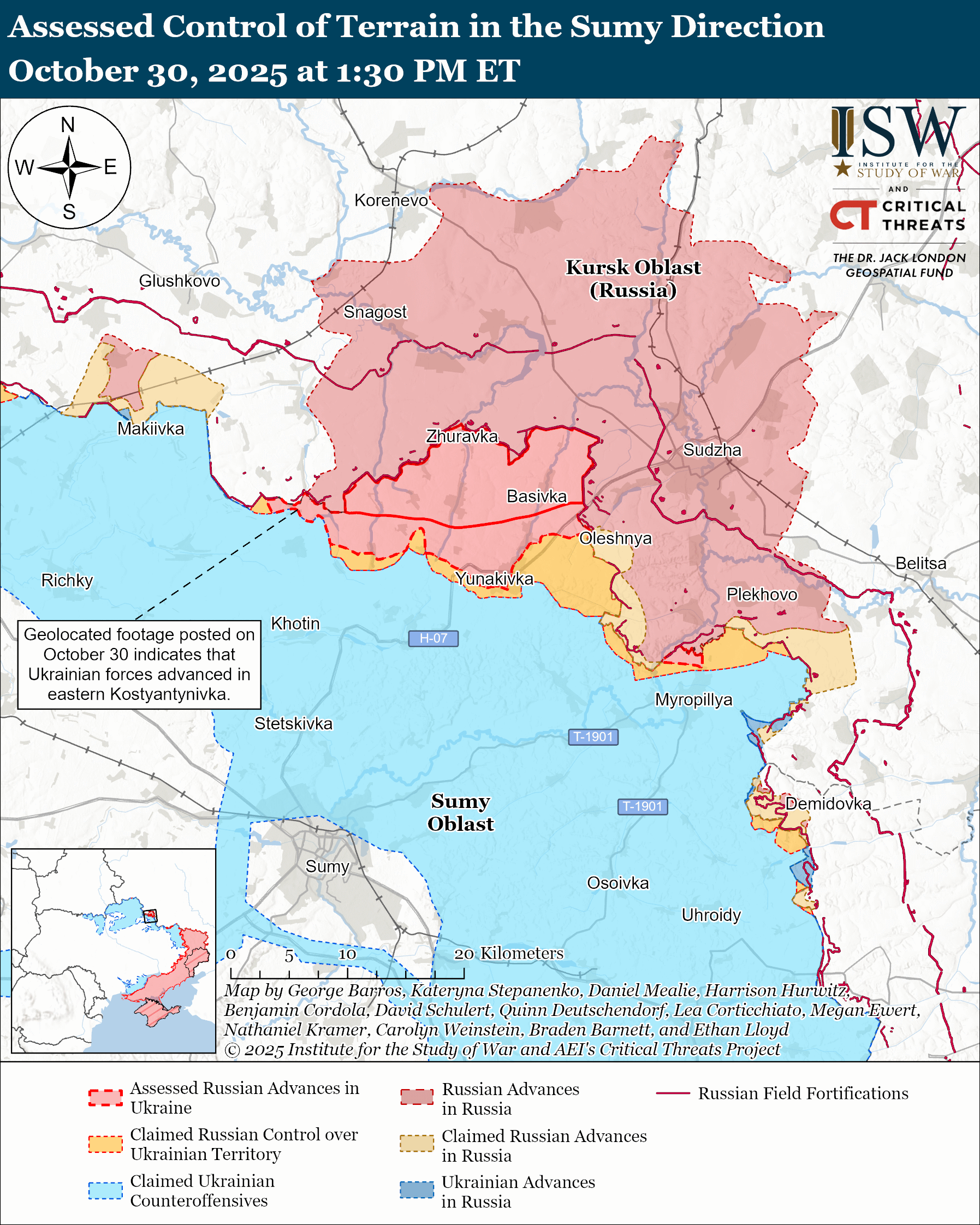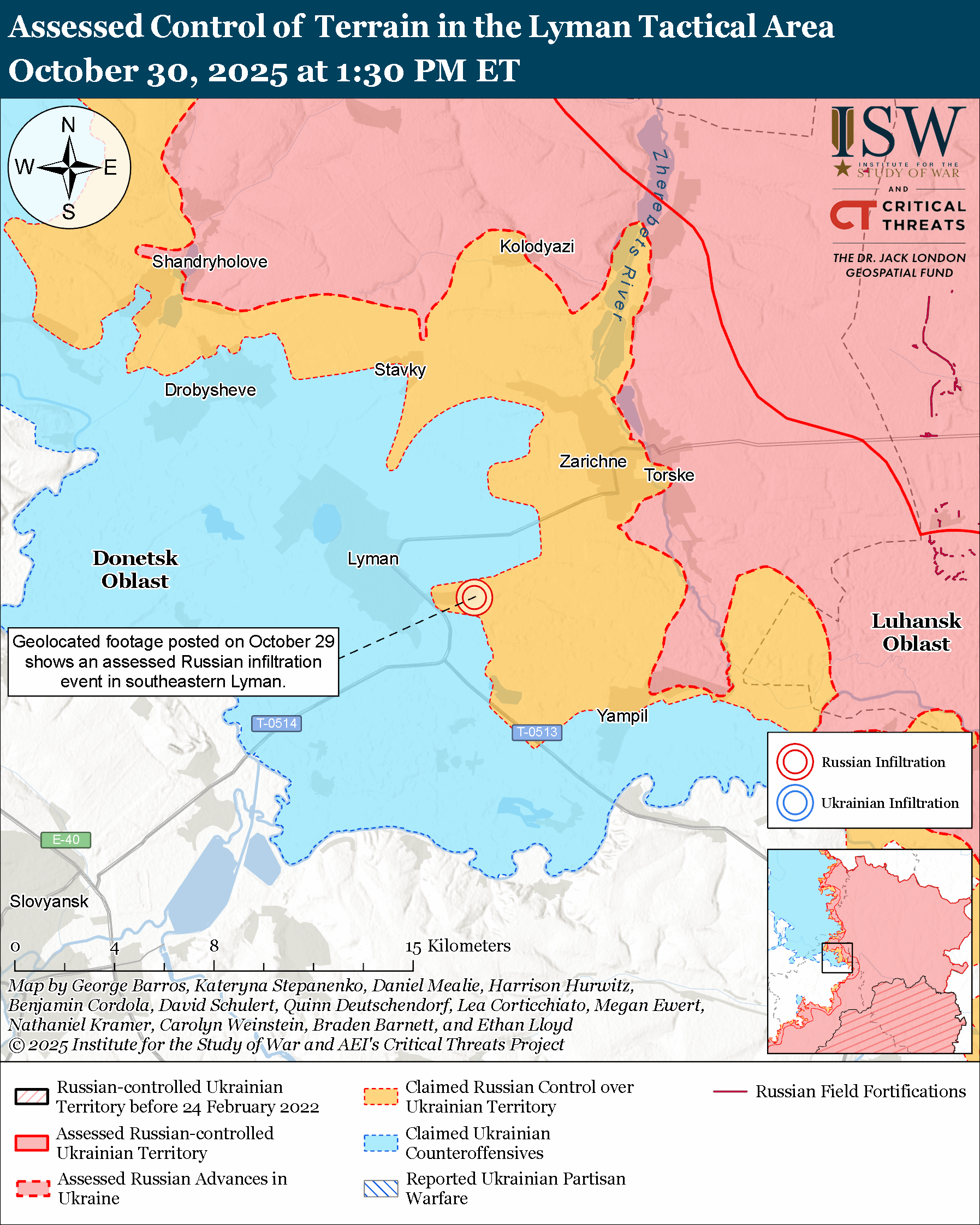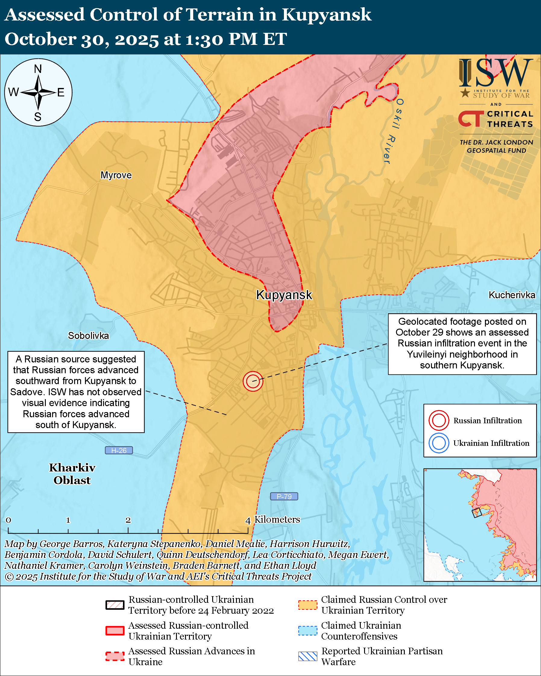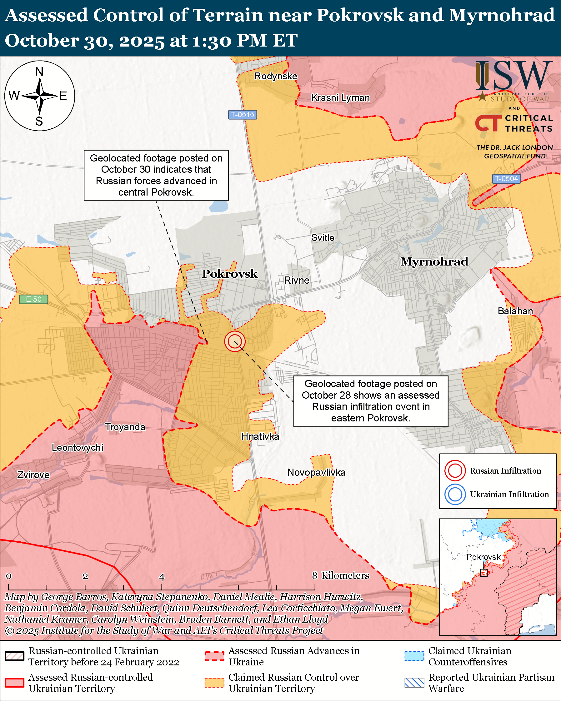 Ukrainian military sources continued to provide details about the difficult situation in the Pokrovsk pocket. Ukrainian soldiers and commanders operating in the Pokrovsk direction continued to indicate that Russian infiltration missions and force accumulations are complicating Ukrainian assault and defense operations and efforts to control Russian movements within the Pokrovsk pocket.[viii] The Ukrainian 7th Rapid Reaction Corps of the Air Assault Forces reported that Russian forces are taking advantage of poor weather to resume infiltration tactics in the Pokrovsk direction to inflate the extent of Russian gains.[ix] A Ukrainian brigade commander reported that heavy autumnal rains are preventing Russian forces from establishing logistics in Pokrovsk, however.[x] Both Ukrainian sources indicated that Russian drone operations are successfully interdicting Ukrainian ground lines of communication (GLOCs) to and within Pokrovsk and to Myrnohrad.[xi] A Kremlin-affiliated Russian milblogger claimed that drone operators of the Russian Rubikon Center for Advanced Unmanned Technologies have established a drone equivalent of "air superiority" in the Pokrovsk direction.[xii] The Ukrainian military sources reported that Russian forces, including drone operators, continue to dress as civilians – perfidy under international law – to conduct infiltration missions without detection.[xiii] An image from German outlet BILD shows a Russian soldier dressed as a civilian and wearing no military insignia in a high-rise building in Pokrovsk.[xiv] Ukrainian Commander-in-Chief General Oleksandr Syrskyi visited Ukrainian commanders operating in the Pokrovsk direction and reported on October 30 that Russian claims of encircling Ukrainian forces within Pokrovsk or Myrnohrad are false.[xv]