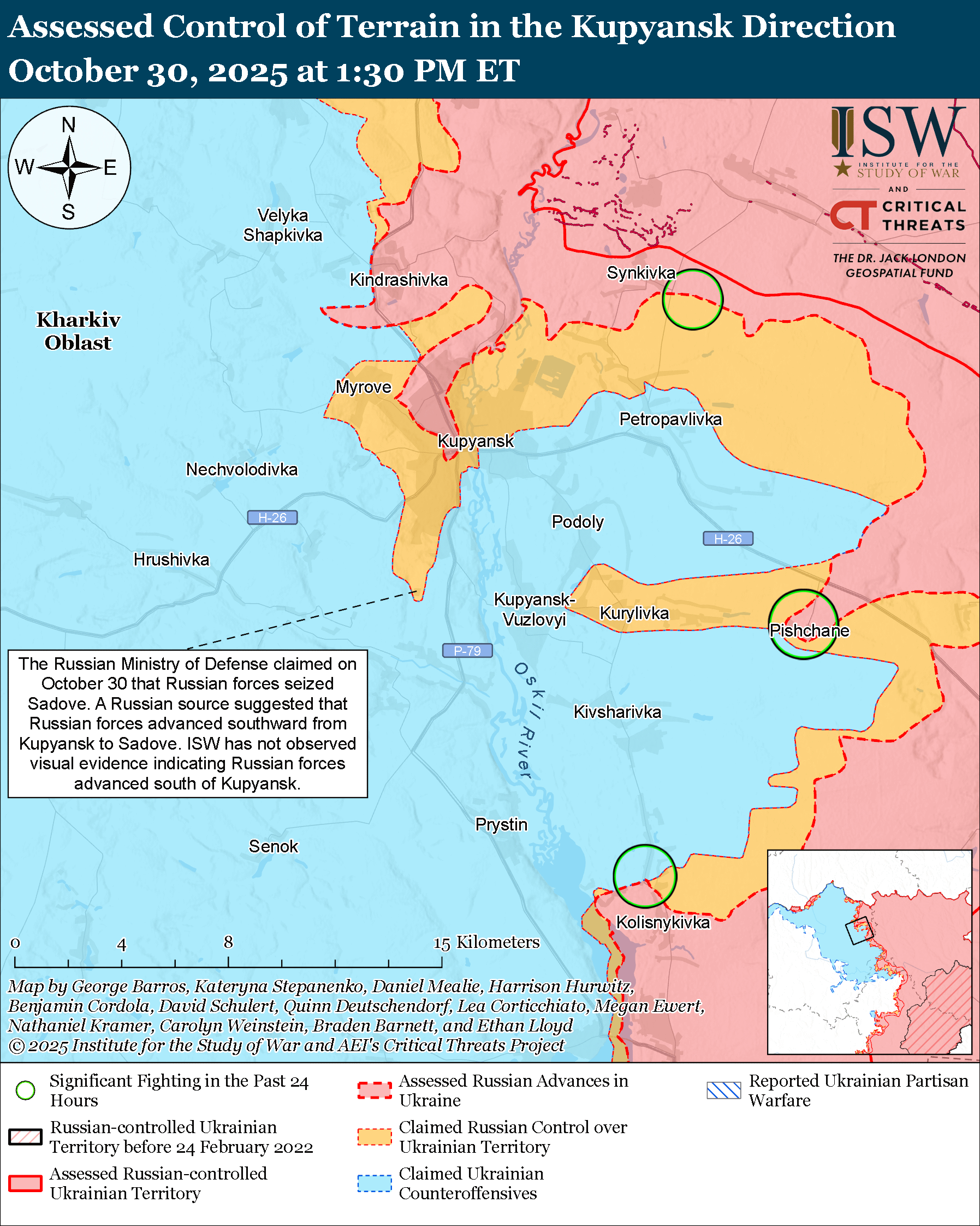 Unconfirmed claims: The Russian Ministry of Defense (MoD) and Russian milbloggers claimed on October 30 that Russian forces seized Sadove (south of Kupyansk) and advanced in southwestern Kupyansk.[xlvi] A Russian milblogger claimed that Russian forces advanced northwest and northeast of Sadove and that Osynovo (just south of Sadove) is a contested "gray zone."[xlvii] ISW has not observed evidence indicating that Russian forces have advanced south of Kupyansk.
