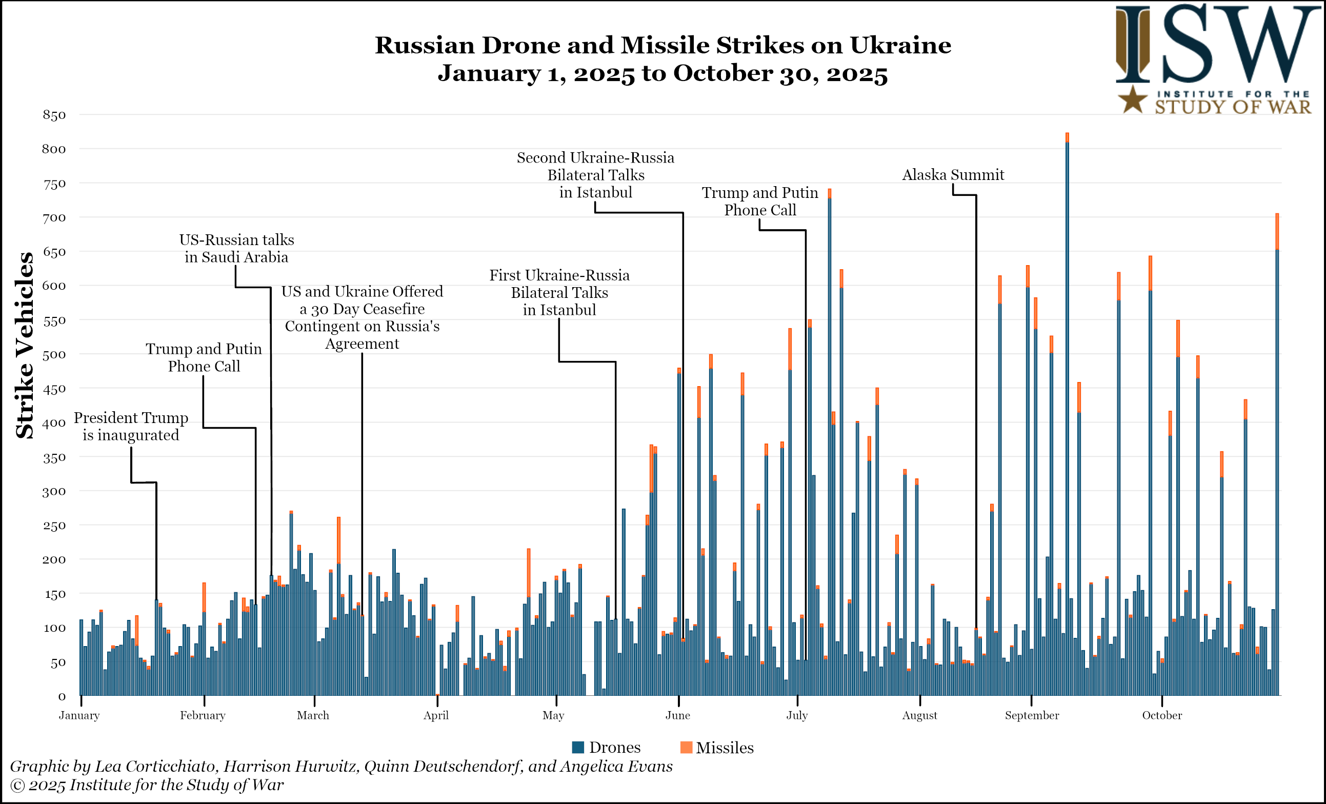 - Russian forces conducted a large-scale series of missile and drone strikes including over 700 projectiles against Ukraine on the night of October 29 to 30.