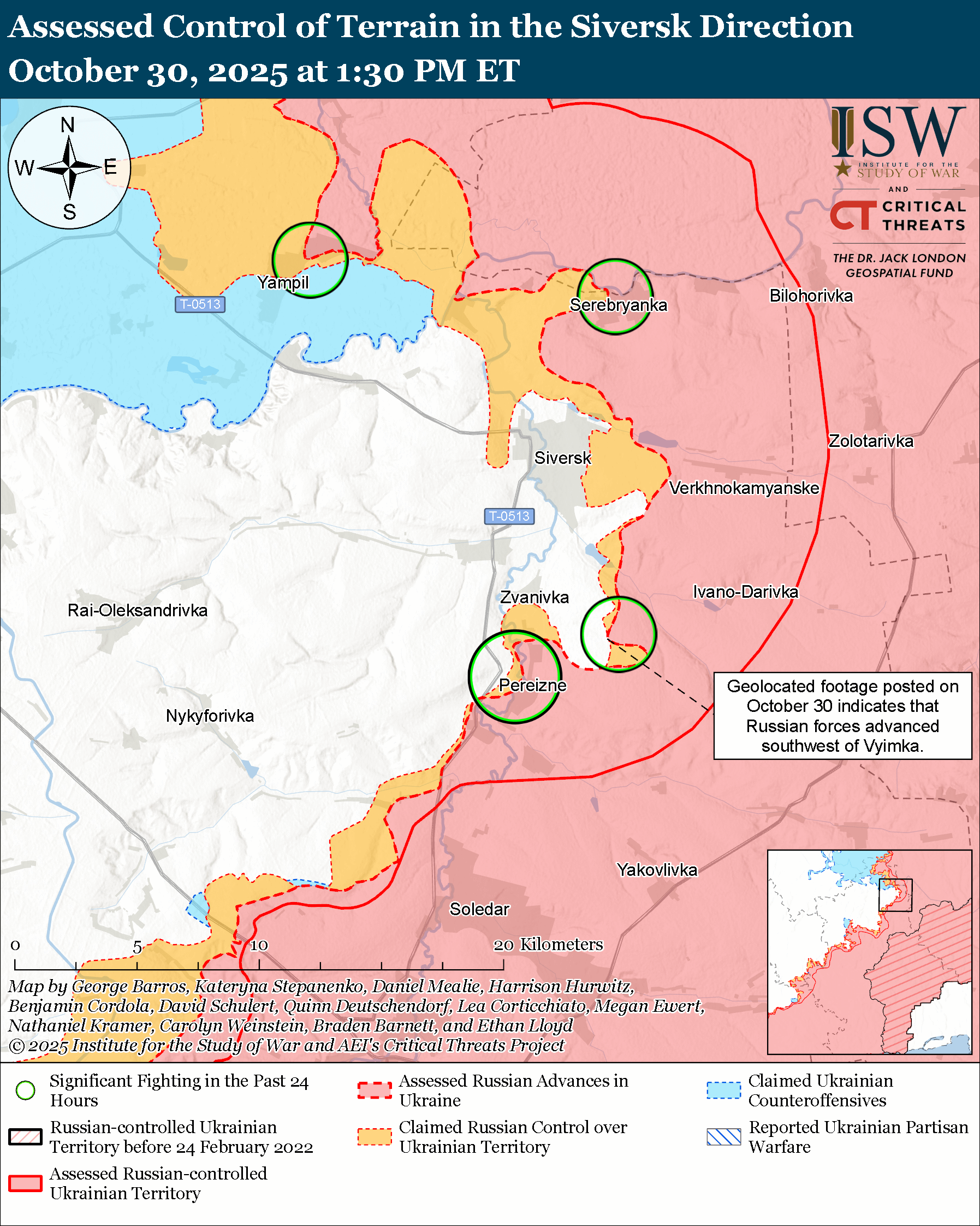 Refinement of areas under Russian claims: Geolocated footage published on October 29 indicates that Ukrainian forces maintain positions or recently advanced in southern Novoselivka (northwest of Lyman), in an area where Russian sources previously claimed that Russian forces maintained a presence.[liii]