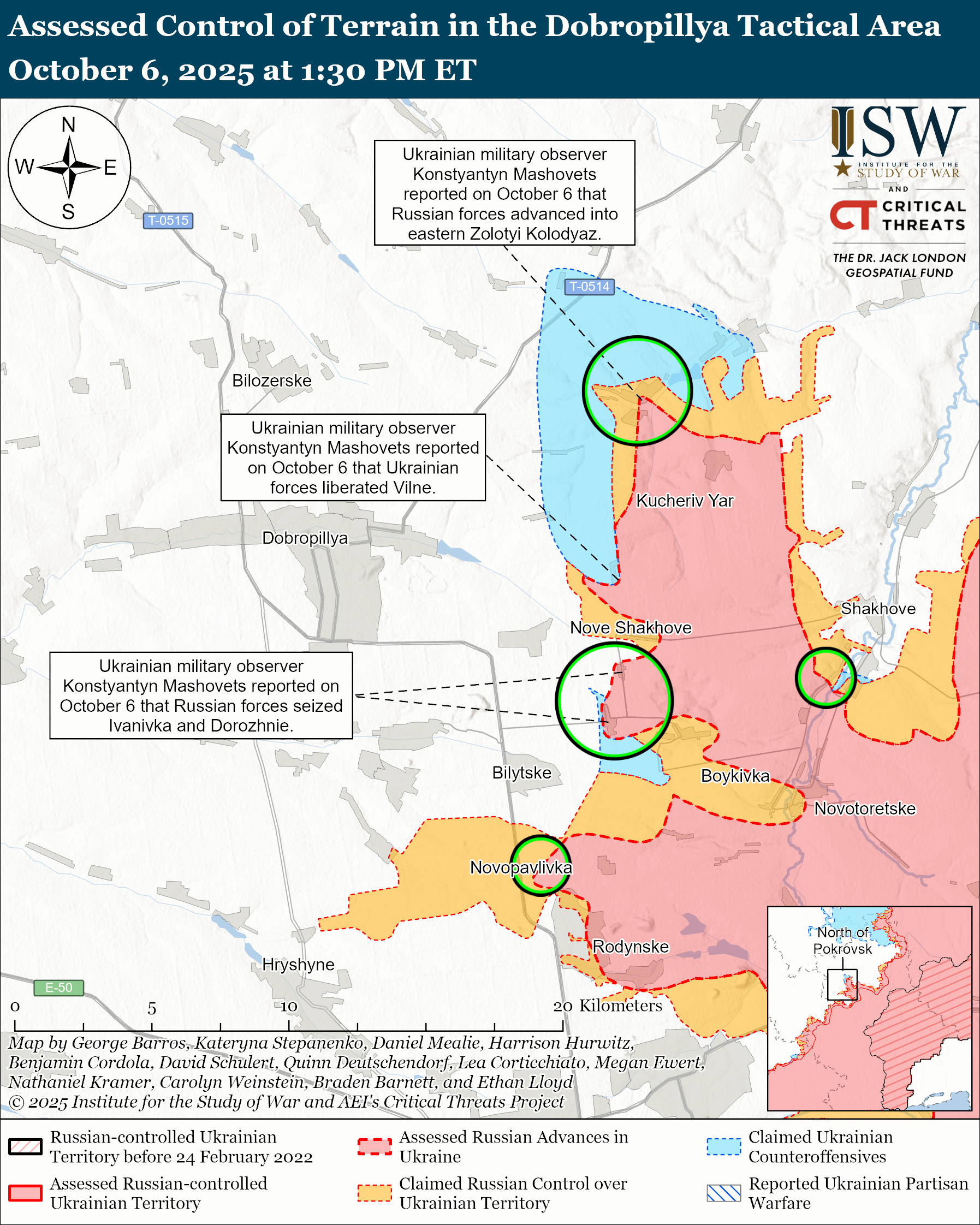 Assessed Ukrainian advances: Mashovets reported on October 6 that Ukrainian forces seized Vilne (east of Dobropillya).[82] Mashovets stated that Ukrainian forces continue to hold Vesele and Hruzke (both northeast of Dobropillya) and maintain positions near Zapovidne and Pankivka (both southeast of Dobropillya).[83]