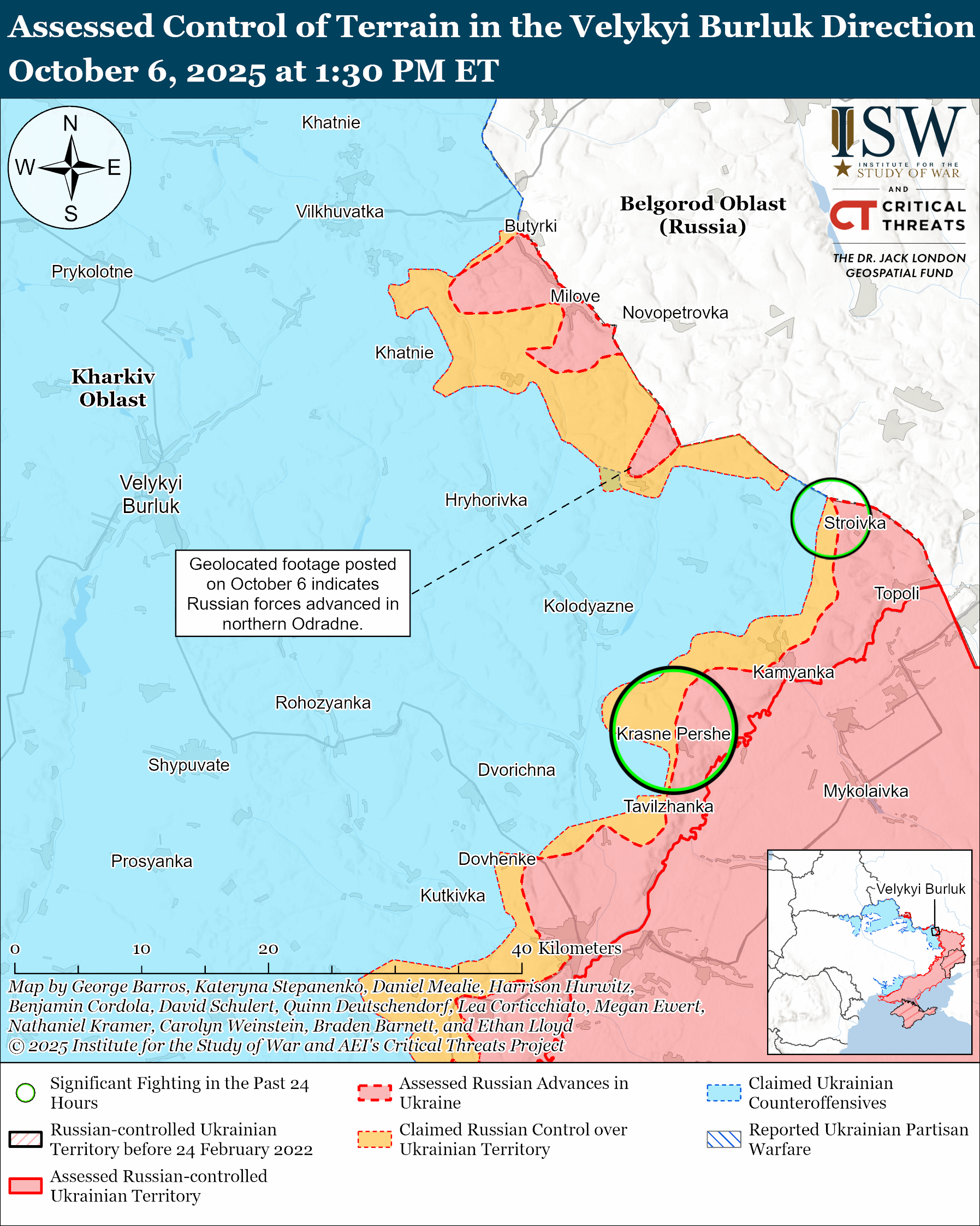 Assessed Russian advances: Geolocated footage published on October 6 shows Russian servicemembers raising a Russian flag in northern Odradne (east of Velykyi Burluk), indicating that Russian forces recently advanced in the area.[50]