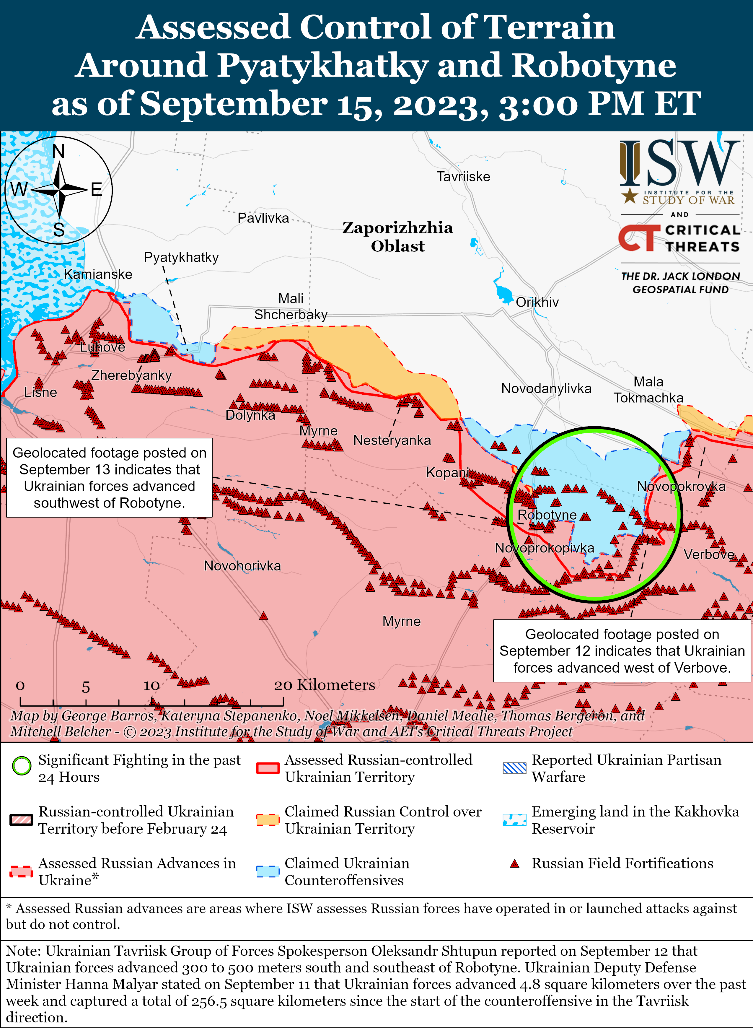 - Ukrainian forces liberated Andriivka in the Bakhmut area on September 14 and continued offensive operations near Bakhmut and in western Zaporizhia Oblast on September 15.