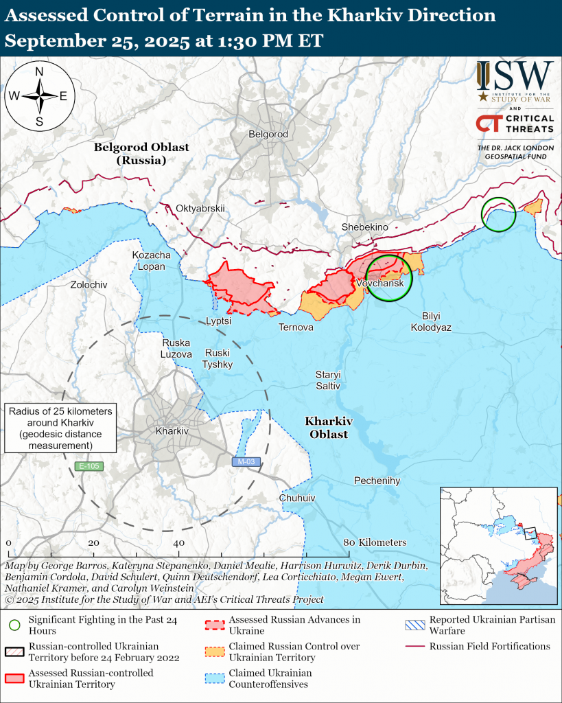 Russian forces continued offensive operations in northern Kharkiv Oblast on September 25 but did not make confirmed advances.