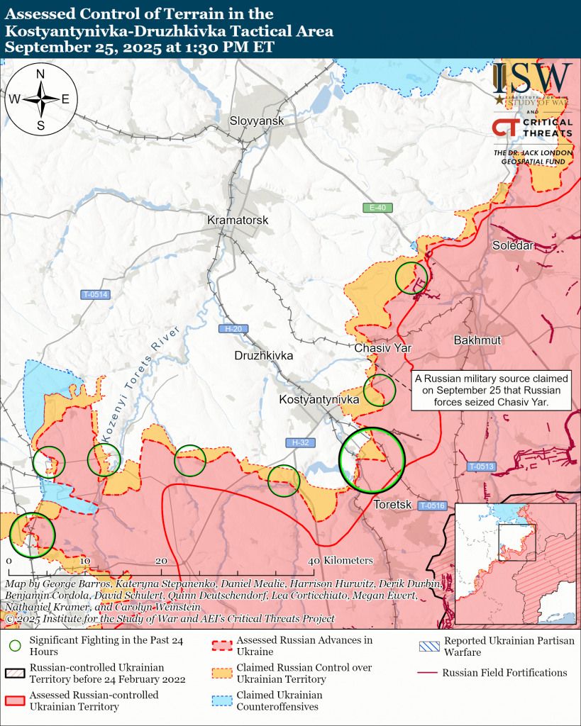 Russian forces continued offensive operations in the Kostyantynivka-Druzhkivka tactical area on September 25 but did not make confirmed advances.