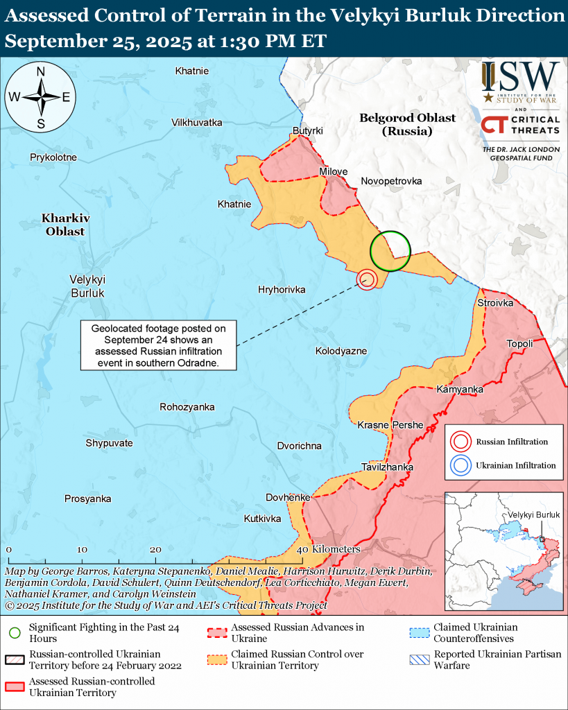 Geolocated footage published on September 24 shows Ukrainian forces striking a Russian-occupied building in southern Odradne.[56] ISW assesses that Russian forces likely conducted an infiltration mission in the area and that this event does not constitute a change in the Russian control of terrain.