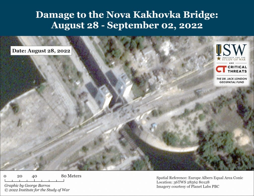 Social media footage from residents of Kherson Oblast provides visual evidence of Ukrainian strikes in western and central Kherson Oblast. Geolocated footage shows the aftermath of a Ukrainian strike on the “Lost World” hotel and sports complex in Kherson City on September 3.[15] Ukrainian sources claimed that the complex belonged to the Russian-backed head of the Kherson occupation administration, Volodymyr Saldo.[16] The Ukrainian General Staff noted on September 2 that the Russian company that was based in the ”Lost World” sports complex previously looted the property and fled to occupied Crimea.[17] Elements of the Russian-backed occupation regime likely used the ”Lost World” complex as some sort of headquarters. Local residents additionally posted footage of the aftermath of a Ukrainian strike on a Russian ammunition depot in Oleshky, about 8km southeast of Kherson City across the Dnipro River.[18] Geolocated footage also shows a destroyed Russian Pantsir-S1 air defense system in Oleshky.[19] Social media footage of explosions in Nova Kakhovka (55km east of Kherson City) supports satellite imagery from September 2 depicting that the Nova Khakovka dam bridge has partially collapsed due to Ukrainian strikes.[20] The satellite imagery shows a roughly 20m-by-9m segment of the bridge has fallen into the river, which has likely rendered this section of the dam bridge inoperable (see below image).[21]