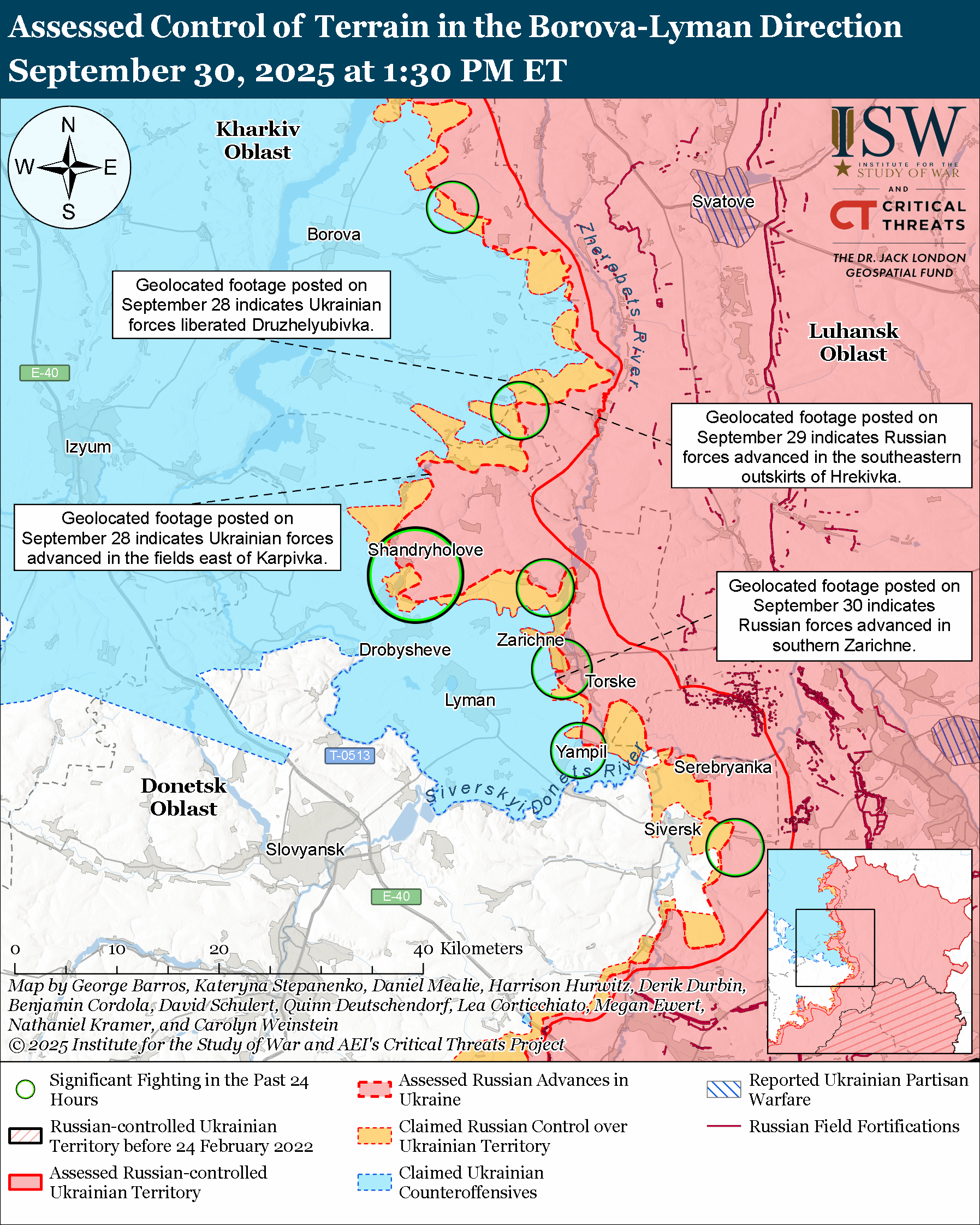 Russian forces continued assaults southeast of Borova near Hrekivka and Olhivka on September 29 and 30.[37]