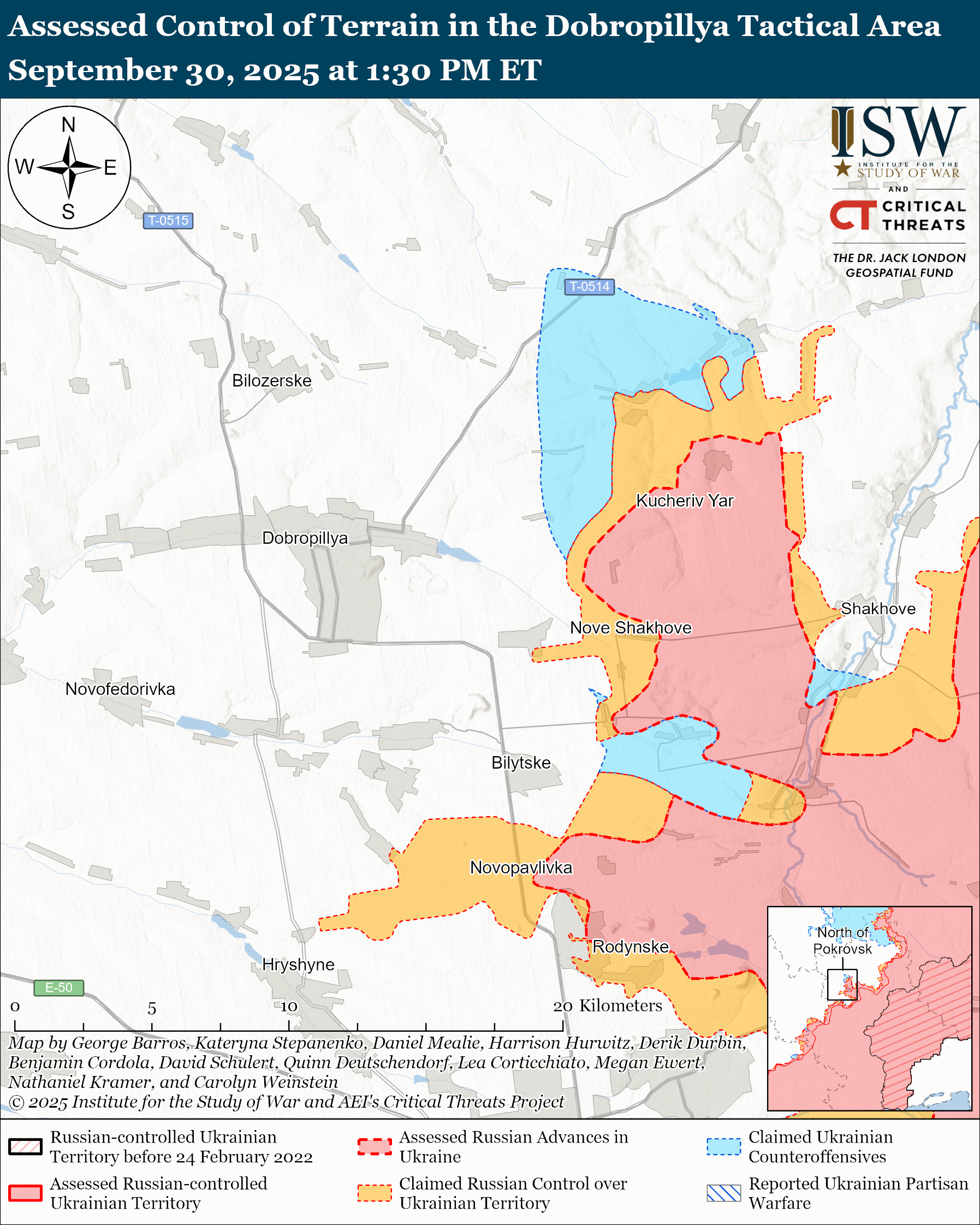 Russian forces continued offensive operations in the Dobropillya tactical area on September 30 but did not make confirmed advances.