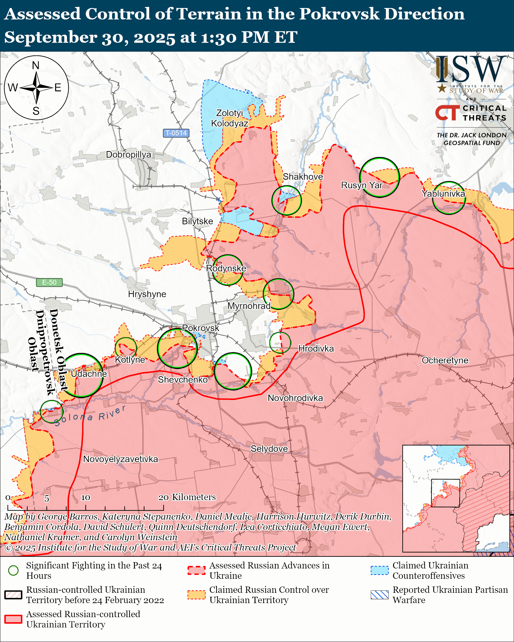 Russian forces attacked near Pokrovsk itself; northwest of Pokrovsk toward Hryshyne; north of Pokrovsk near Rodynske; northeast of Pokrovsk near Krasnyi Lyman and Novoekonomichne; east of Pokrovsk near Myrnohrad, Myrolyubivka, and Promin and toward Kozatske and Balahan; southeast of Pokrovsk near Novopavlivka and Lysivka; southwest of Pokrovsk near Kotlyne, Udachne, Molodetske, and Zvirove; and west of Pokrovsk toward Serhiivka on September 29 and 30.[64]