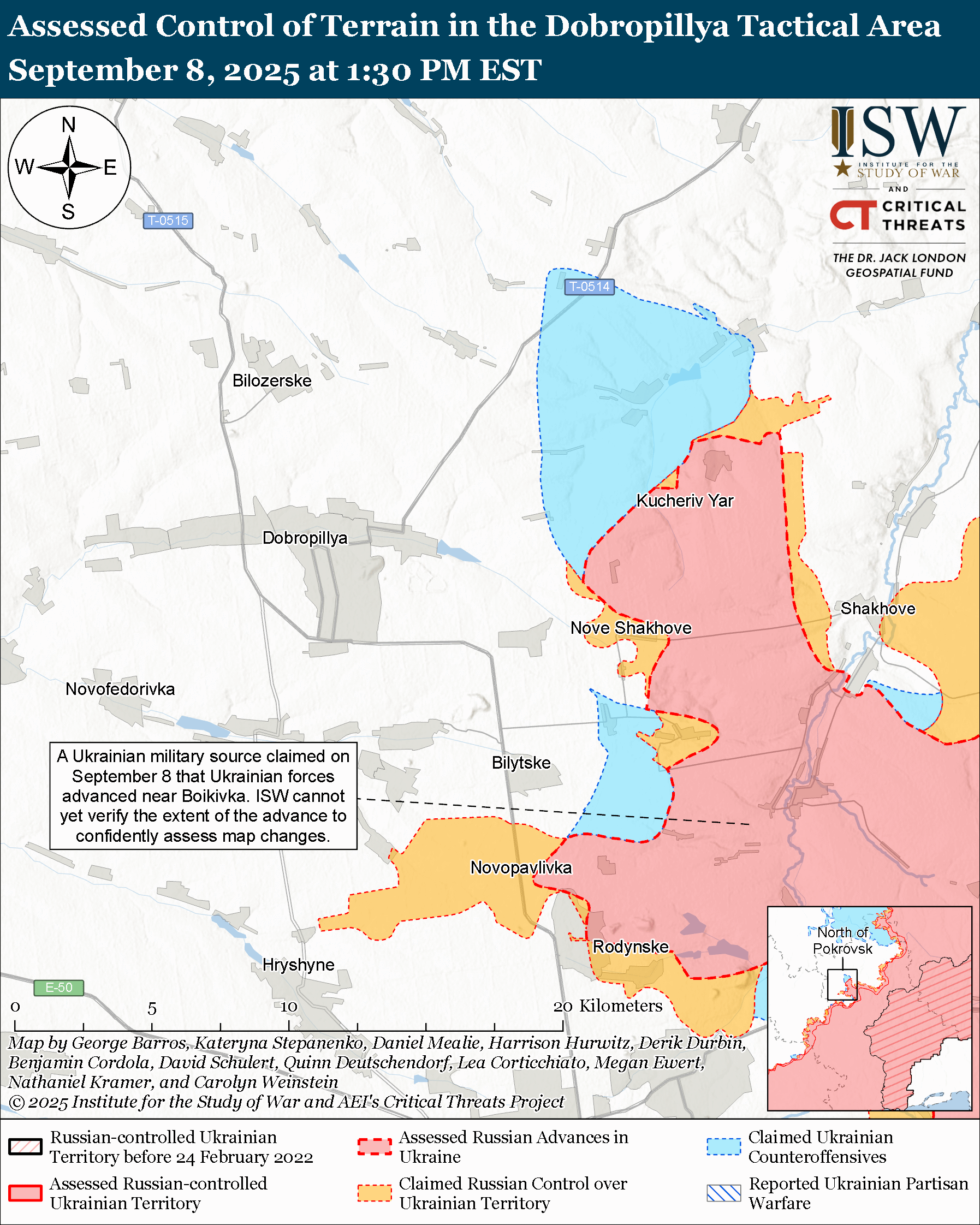 Russian forces continued offensive operations in the Dobropillya tactical area on September 8 but did not make confirmed advances.