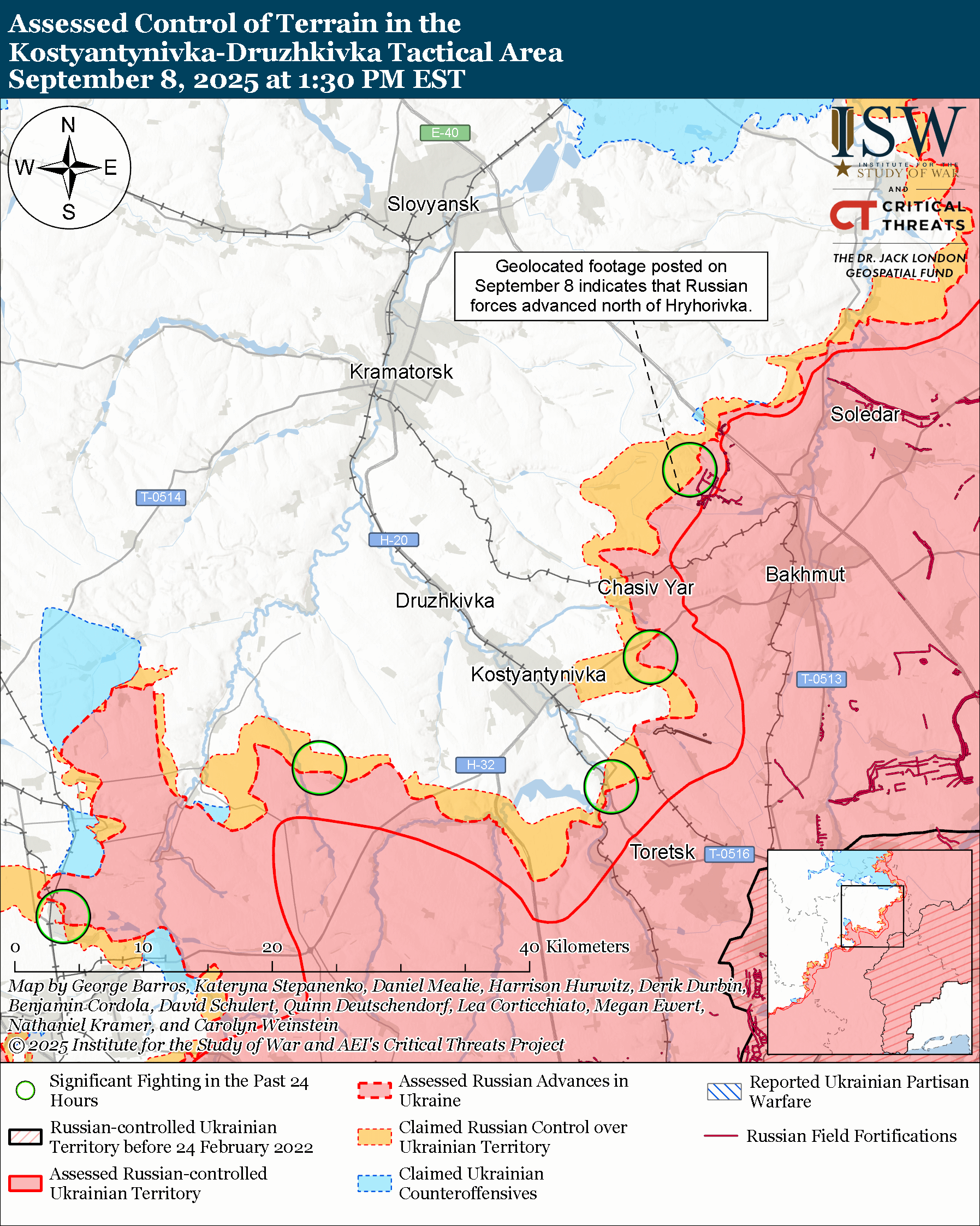 Russian forces attacked northeast of Kostyantynivka near Minkivka, Orikhovo-Vasylivka, and Markove; east of Kostyantynivka near Stupochky and Predtechyne; southeast of Kostyantynivka near Toretsk, Oleksandro-Shultyne, and Dyliivka; south of Kostyantynivka near Pleshchiivka, Kleban-Byk, Nelipivka, and Shcherbynivka; and south of Druzhkivka near Poltavka on September 7 and 8.[xliv]