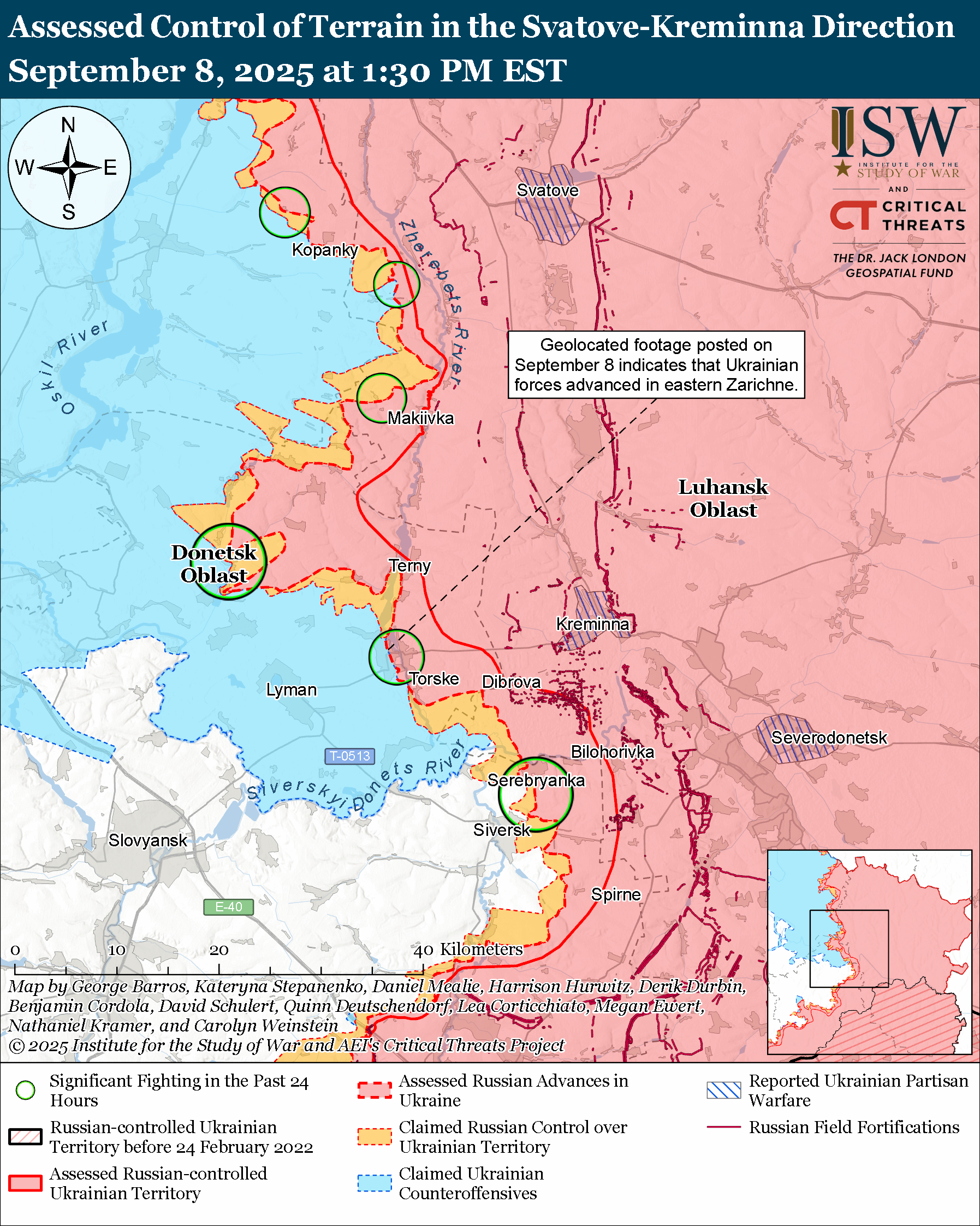 Unconfirmed claims: Mashovets reported on September 8 that Ukrainian forces advanced to Pankivka and Mayak (east of Dobropillya).[l] Russian milbloggers claimed that Russian forces advanced into central Shakhove (east of Dobropillya) and east and southeast of the settlement=.[li] One Russian milblogger claimed on September 7 that Ukrainian forces control Kucheriv Yar (northeast of Dobropillya) and Vilne (east of Dobropillya).[lii] Other Russian milbloggers claimed that almost all of Pankivka is a contested "gray" zone and that Russian forces maintain positions in Zolotyi Kolodyaz (northeast of Dobropillya).[liii]