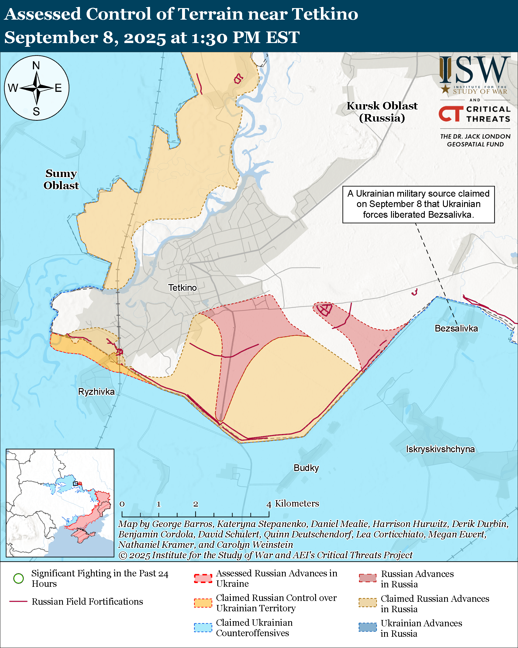 Assessed Ukrainian advances: Ukrainian military observer Kostyantyn Mashovets stated on September 8 that Ukrainian forces retook Bezsalivka (northwest of Sumy City).[xix]