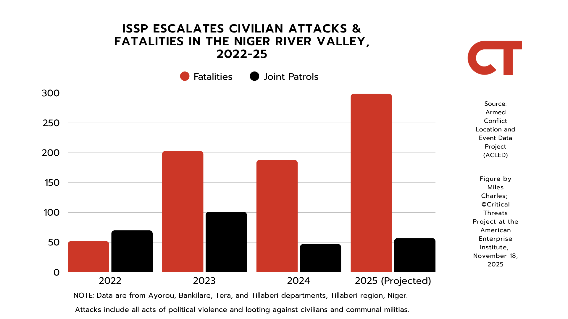 ISSP has escalated the severity of attacks against civilians and civilian militias in the Niger River Valley to quash civilian resistance and establish support zones. The group has historically targeted civilians in the Niger River Valley to play on ethnic tensions between the nomadic Fulani and other rival ethnic groups.[114] ISSP has increased the severity of these attacks every year since 2022. ISSP’s attacks on civilians and civilian militias in the Niger River Valley are nearing its 2022 and 2023 baseline, but it is on pace to inflict nearly as many fatalities in 2025 as it did from 2022 to 2024 combined.[115]