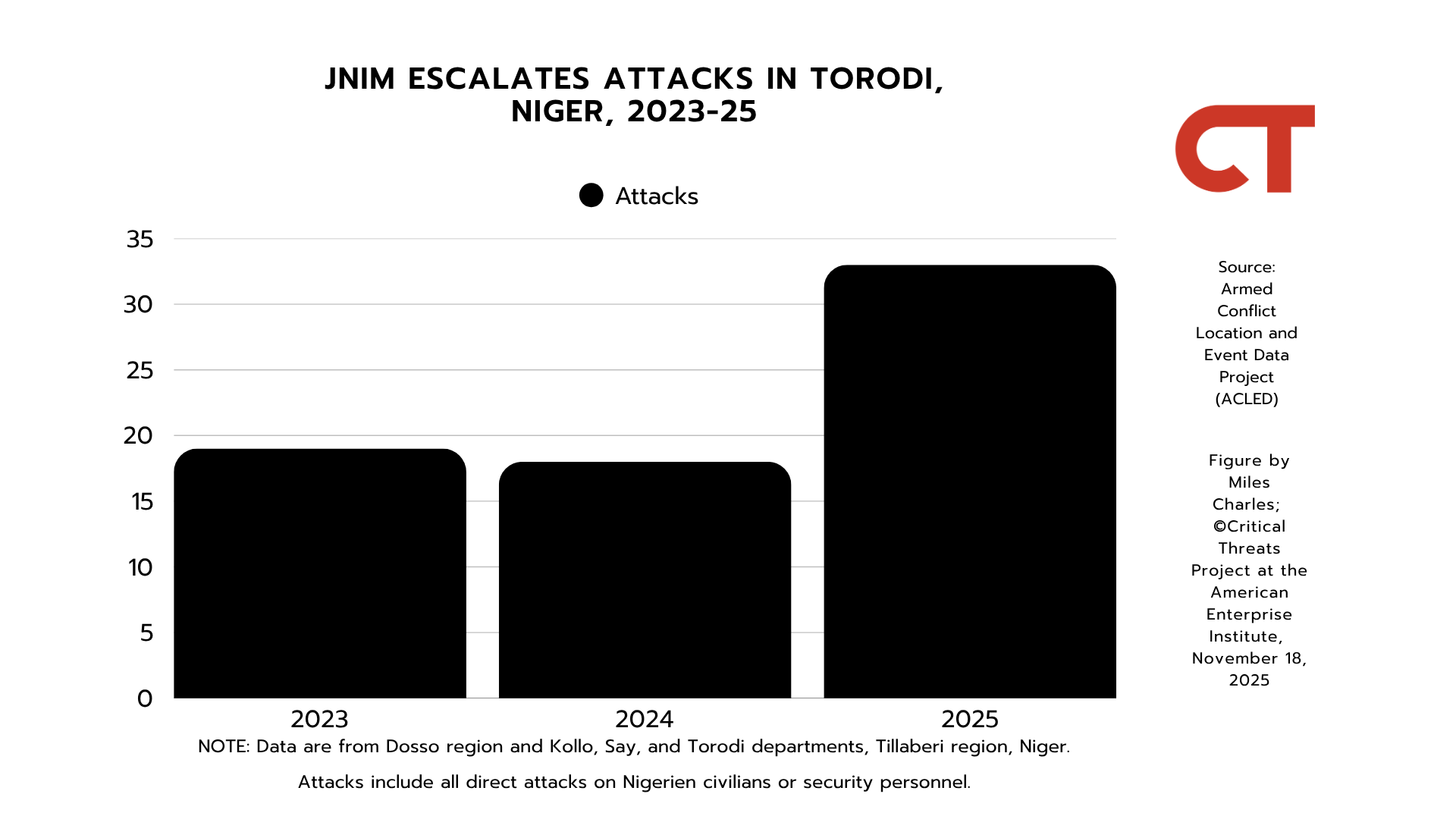 Note: Data are from Ayorou, Bankilaré, Téra, and Tillabéri departments, Tillabéri region, Niger. Attacks include all acts of political violence and looting against civilians and communal militias.