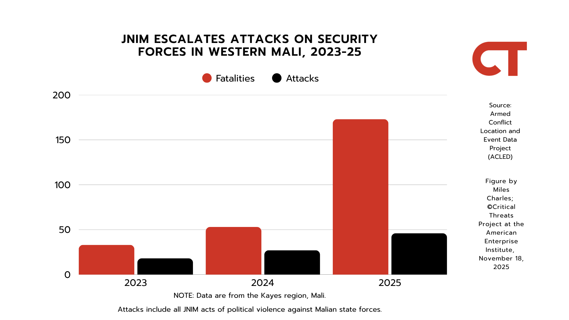 JNIM has escalated activity in western Mali in the second half of 2025 more broadly as part of its ongoing blockade. JNIM has attacked security forces in Kayes region more through November 2025 than in the entirety of 2024.[42] More than 70 percent of these attacks occurred after July.[43] JNIM has also escalated attacks on civilians, conducting nearly three times as many attacks on civilians through November 2025 as it did in 2024 and 2023 combined.[44] Roughly 60 percent of these attacks occurred after July.[45]