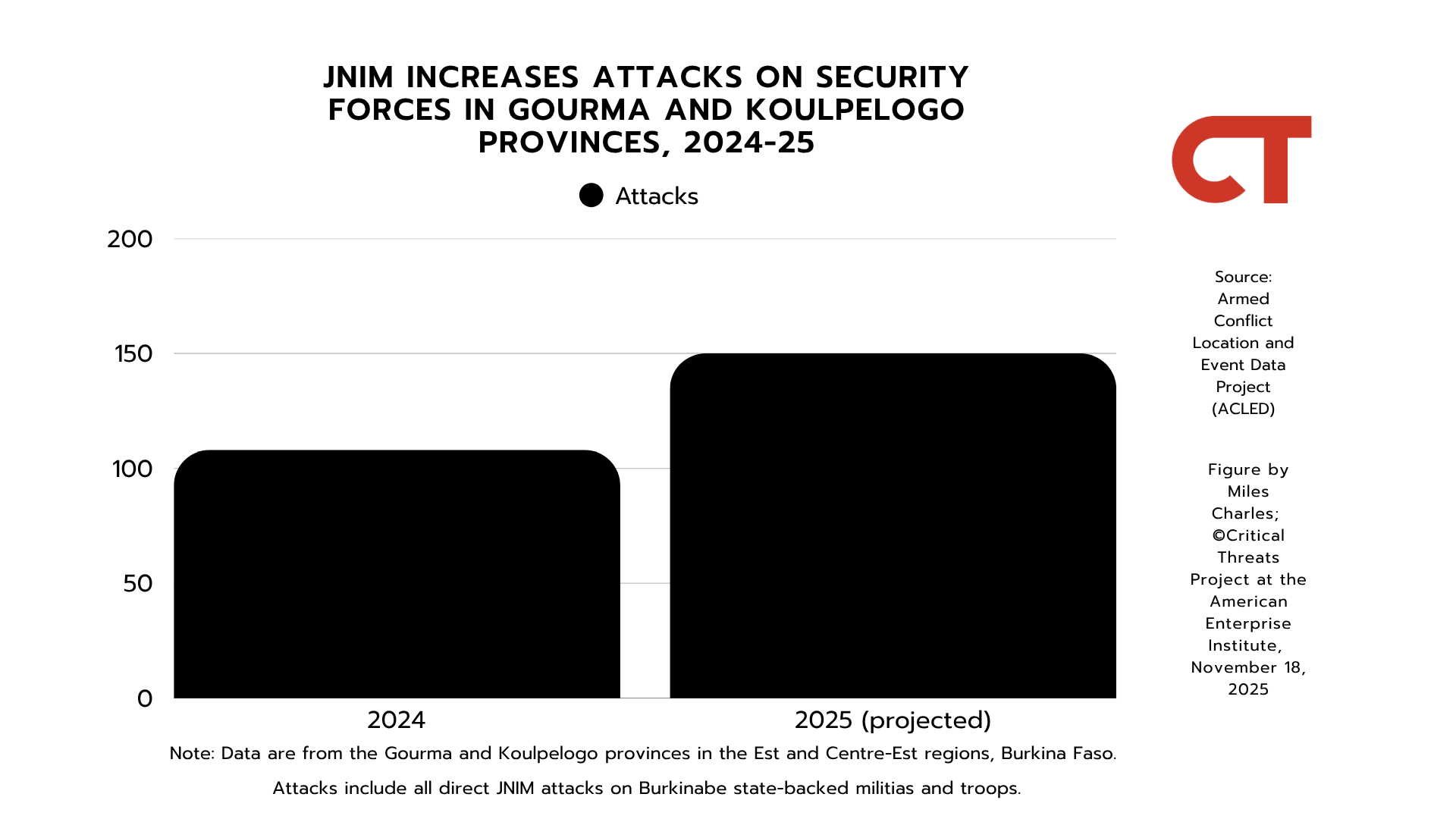JNIM has escalated the rate of its attacks in eastern Burkina Faso throughout 2025. The group has averaged six more attacks a month on security forces in eastern Burkina Faso in 2025 than in 2024 and has set an all-time high in attacks across the Est and Centre-Est regions.[105] JNIM has notably increased its activity in Gourma and Koulpelogo provinces and is on pace to carry out nearly twice as many attacks in 2025 as in 2024.[106] Burkinabe forces have not matched JNIM’s escalated tempo and are projected to record a 27 percent decrease in counterinsurgency operations in 2025 from 2024.[107]
